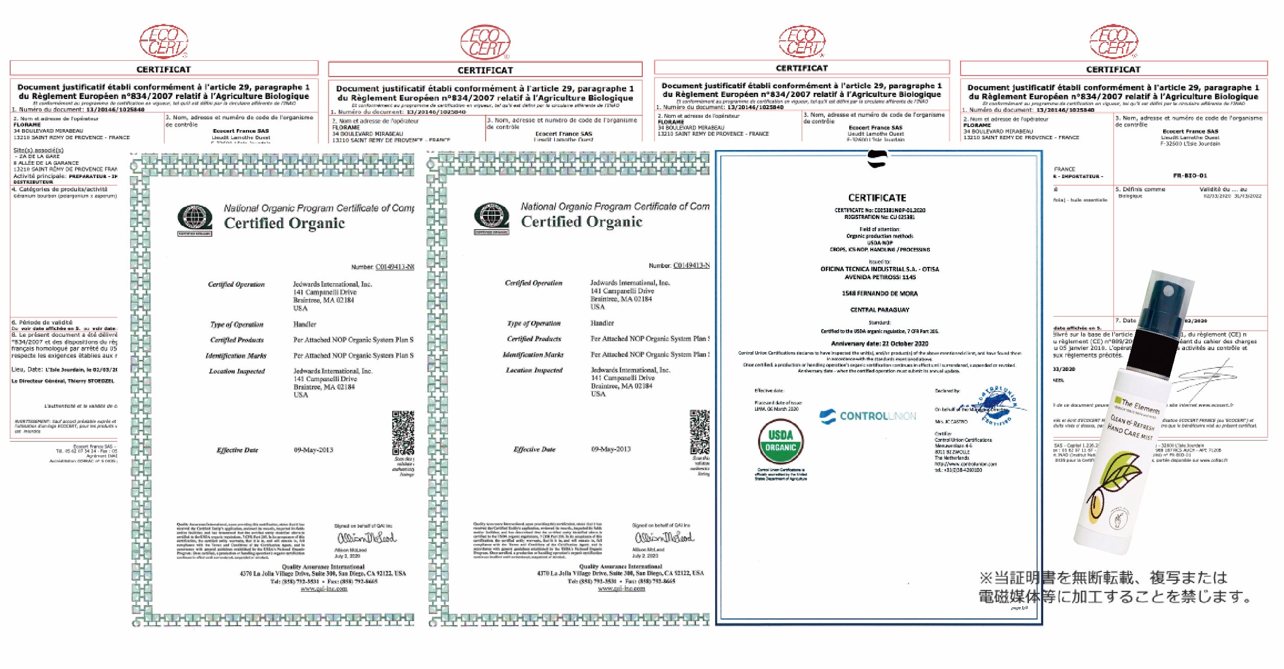 *1 エタノール(基剤)/ *2 体積あたりの濃度/ *3 日本の有機JASをはじめ、USDA(米農務省認証 オーガニック)、BIO SUISSE(スイス有機農法認定機関)を基準とし証明された認証制度/ *4 アルガニアスピノサ核油(保湿成分)