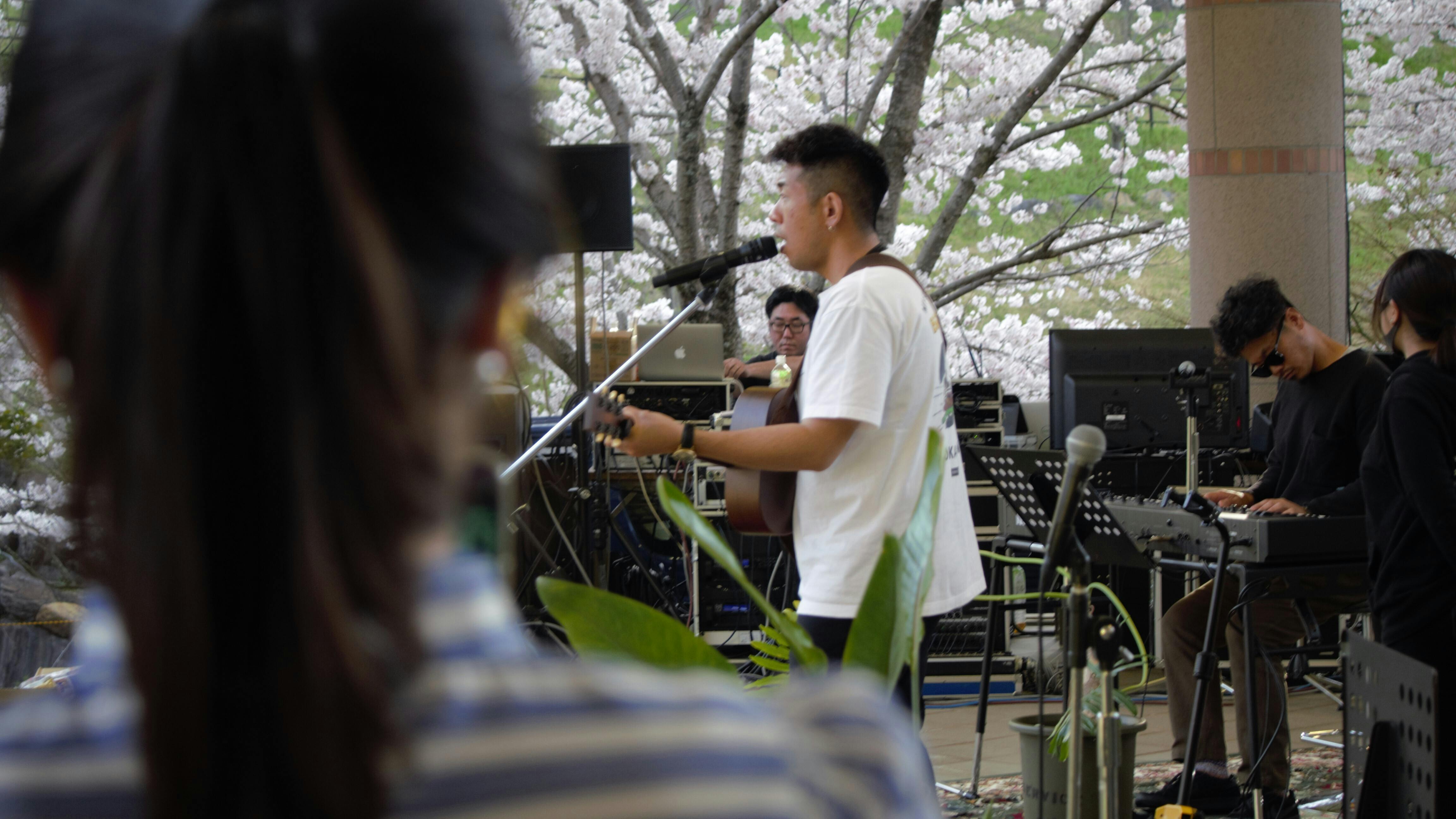 写真は、リハーサルの風景です。手前はMCさん。桜がいっぱいの大変美しい会場です!!