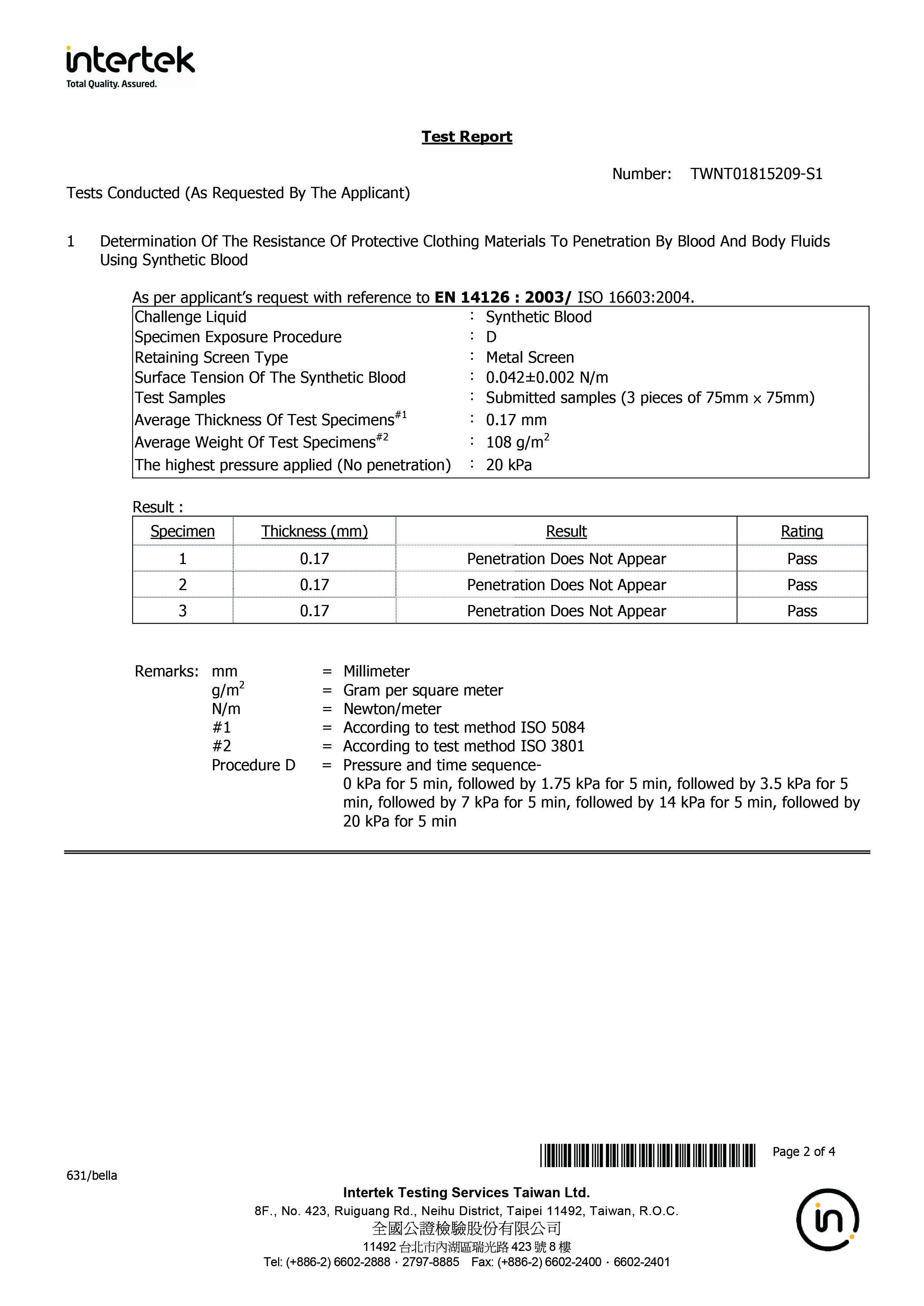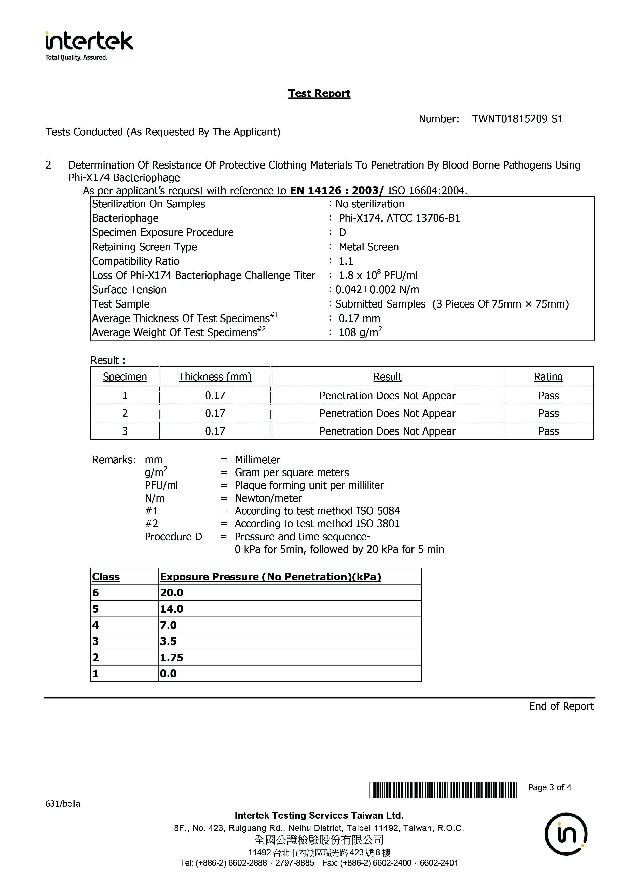 航空会社のウェアでも採用されたこのプロダクト一番の特徴である抗菌性を持つこの生地は、イギリスの世界最王手の一つである認証機関のintertekにて以下を認定済でISO 16603人工血液バリア性試験(JIS T 8060準拠 ) とISO 16604 ウイルスバリア性試験(JIS T 8061 )の基準をクリア。また、この結果は、アメリカ、ヨーロッパで防護服として利用可能な米国医療機器振興協会 (AAMI)、【EN規格】EN 14126:2003に対応。