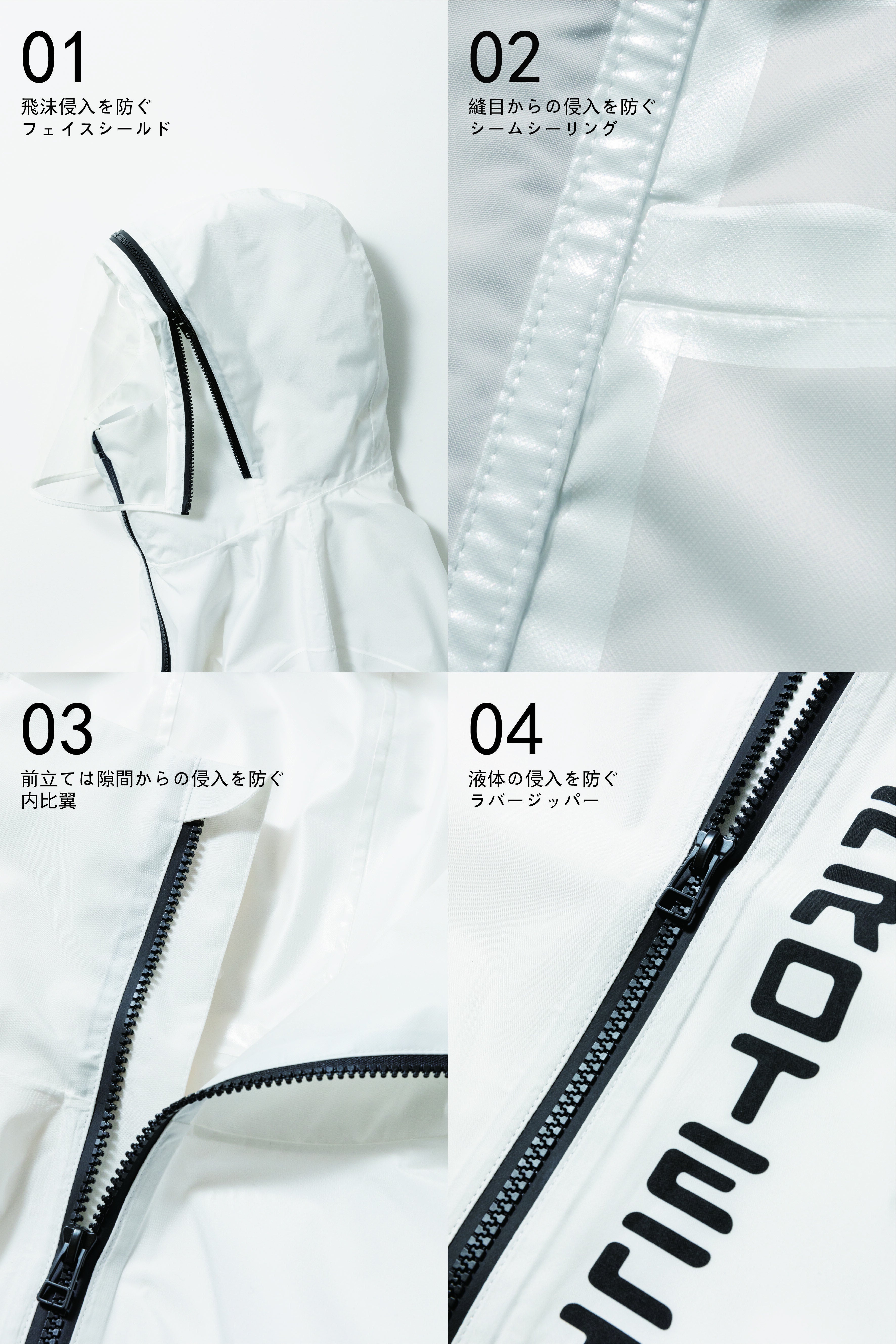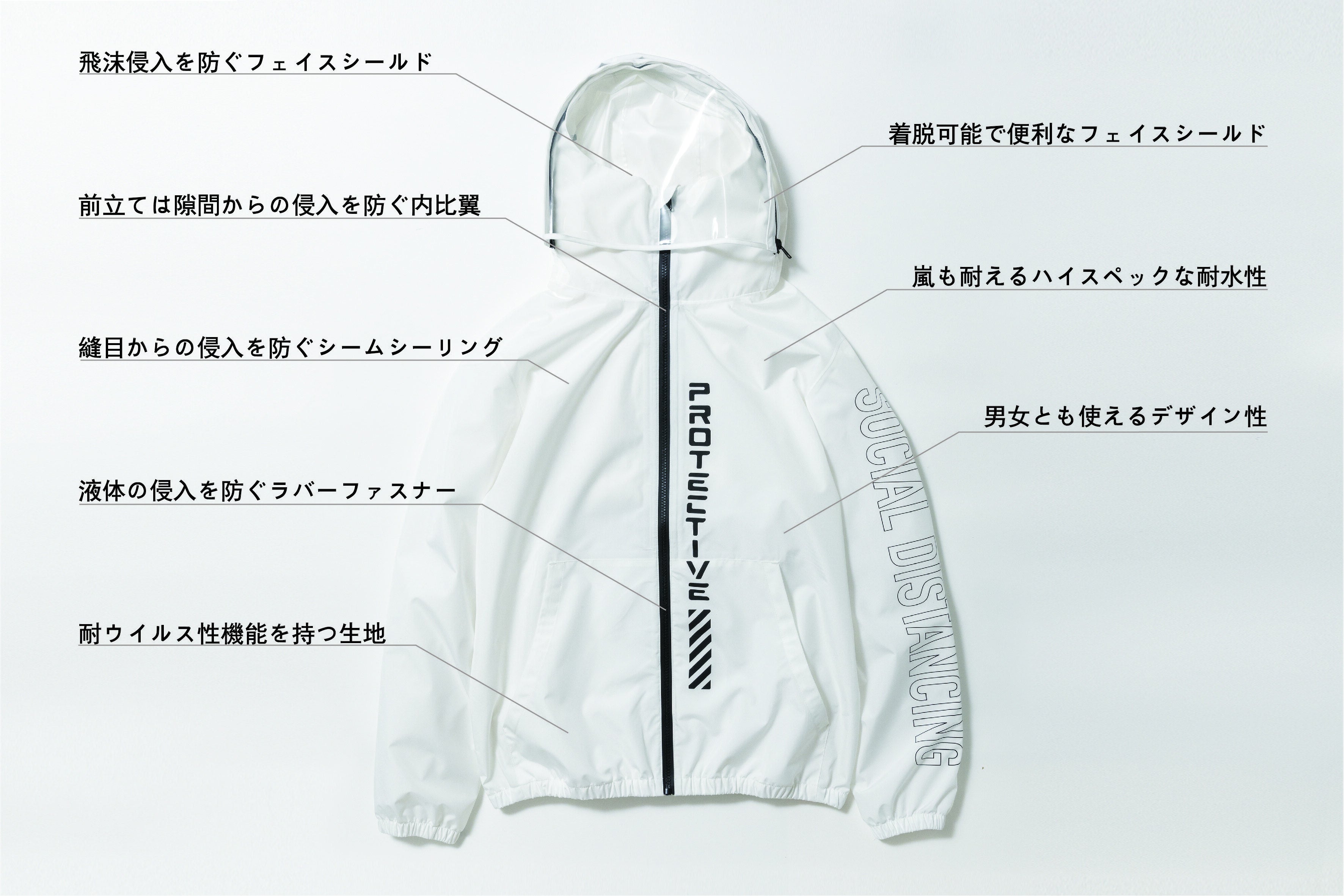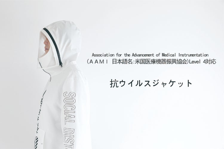 防護服用の人工血液バリア性・ウイルスバリア性試験を通過した生地をアパレルに使用し、既存の雨風を防ぐ機能に加え、『抗ウイルス性』を持つことで、ウイルス対策はマスクと手洗いという常識に、新たな生活概念を付け加えることを可能にした新時代の技術は、世界中を飛び回り、不特定多数の人と接する航空会社にも採用されるほど注目されている.