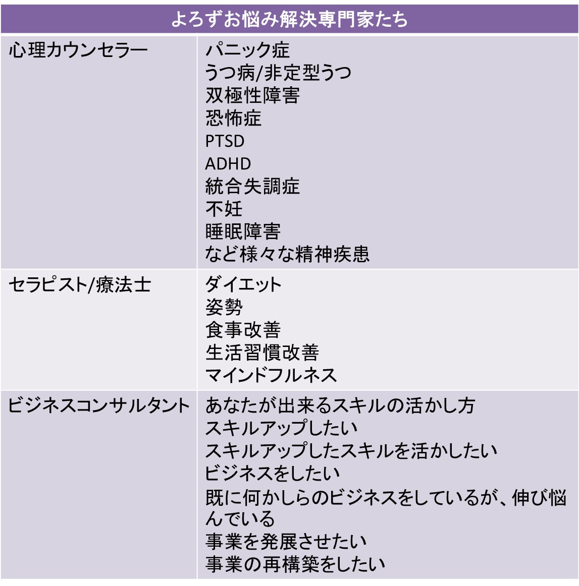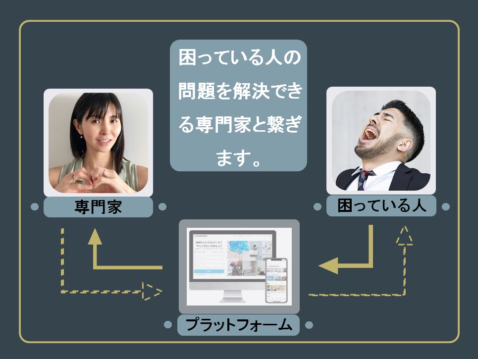 これまで解決できなかった『問題を抱えている⼈』が、問題に特化した相談相⼿を探したり話を聞いてもらえたり、具体的な解決方法を提示してもらえるといった『あなたにあった問題を解決できる⼈』を見つけだし、繋がることができるマッチングプラットフォームです。