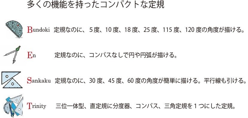 この定規は不便さを解消するだけでなく、製図でよく使う角度や円、寸法線に使う矢印が簡単に描けるようになっています。