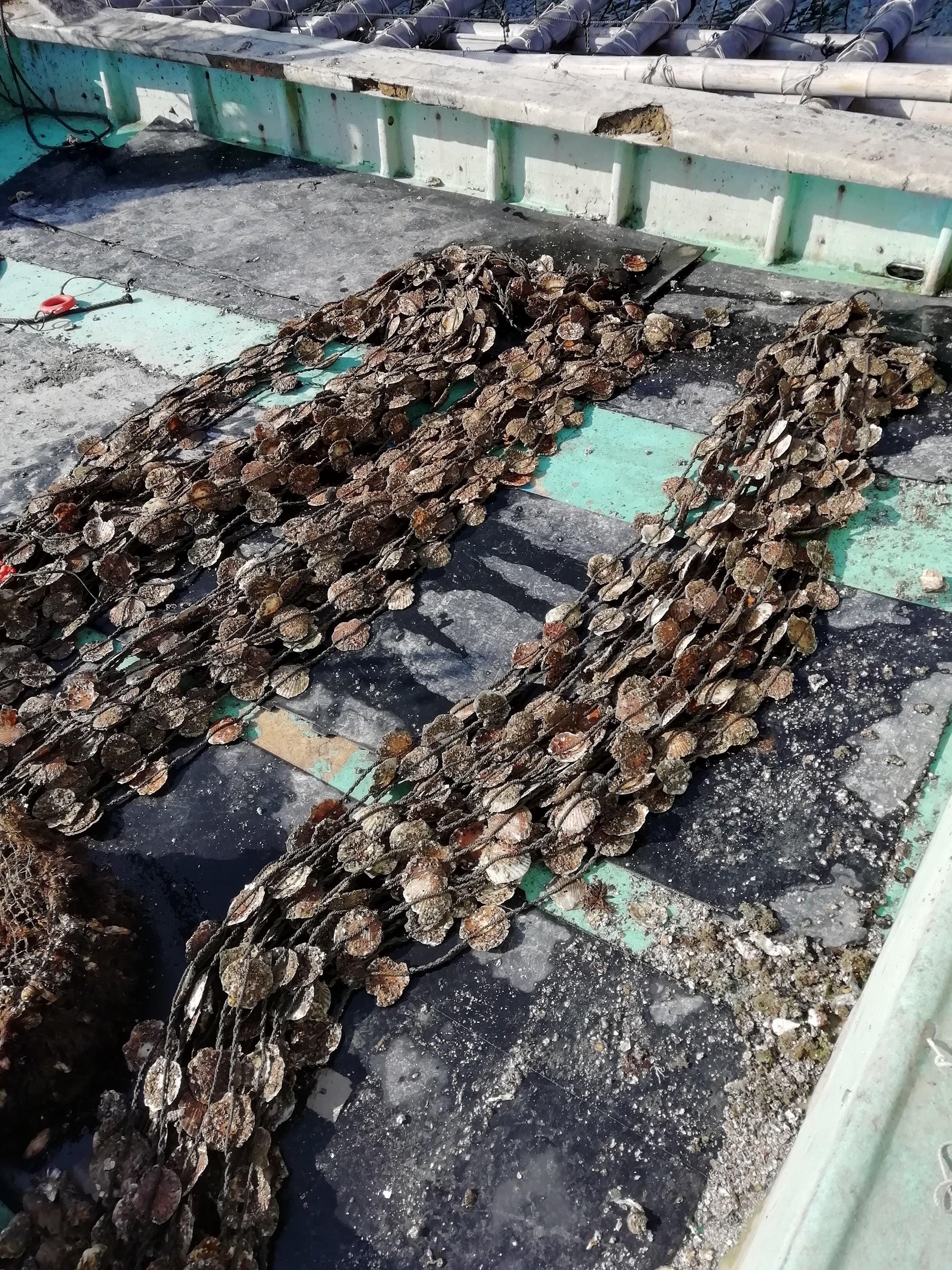牡蠣の養殖は、土台となるホタテの貝殻に牡蠣の幼生を付着させるところ(採苗:さいびょう)から始まります。
