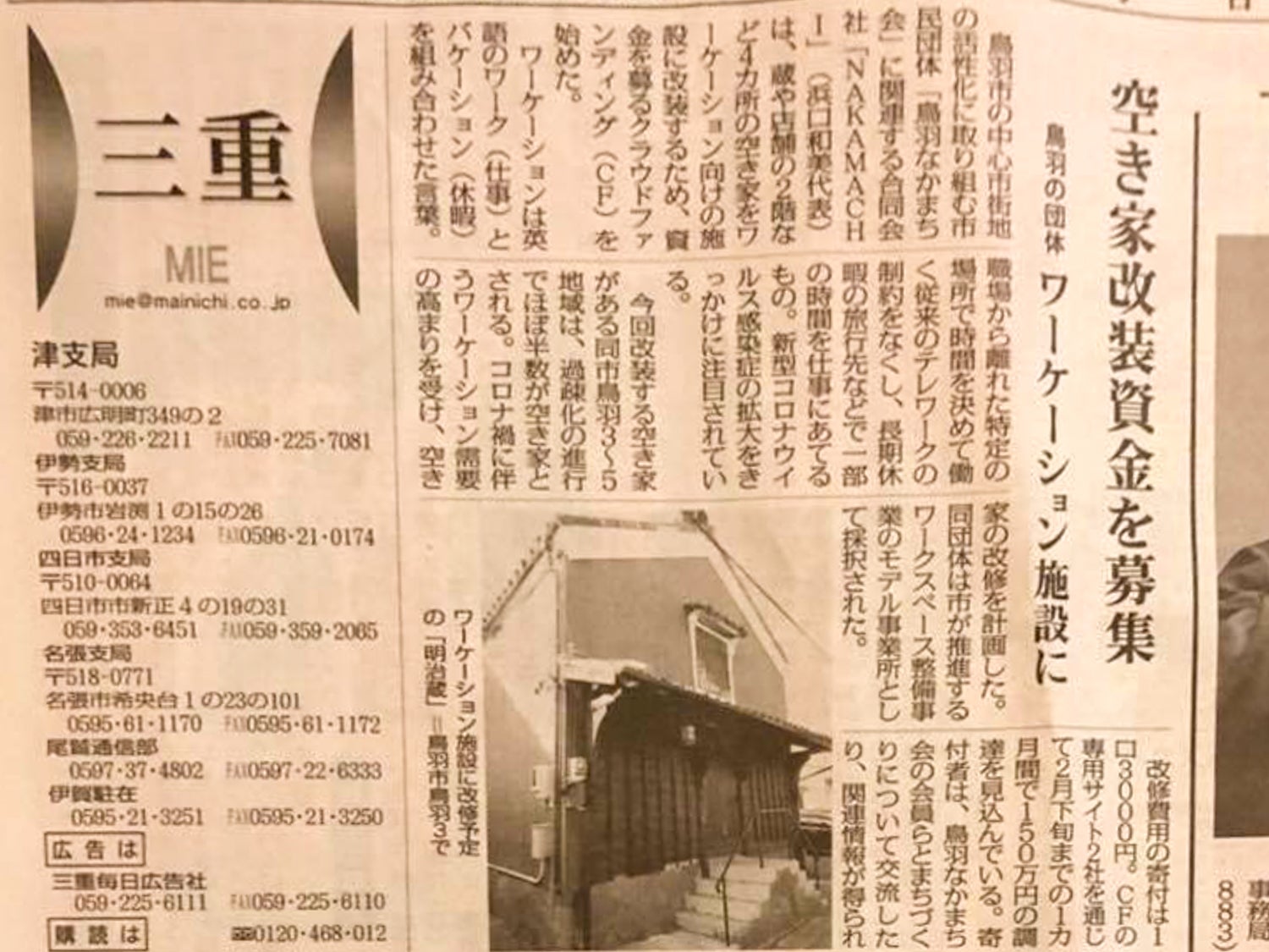2月8日付にて「空き家改築資金を募集 鳥羽の団体 ワーケーション施設に」と題して、毎日新聞さんにご掲載いただきました。