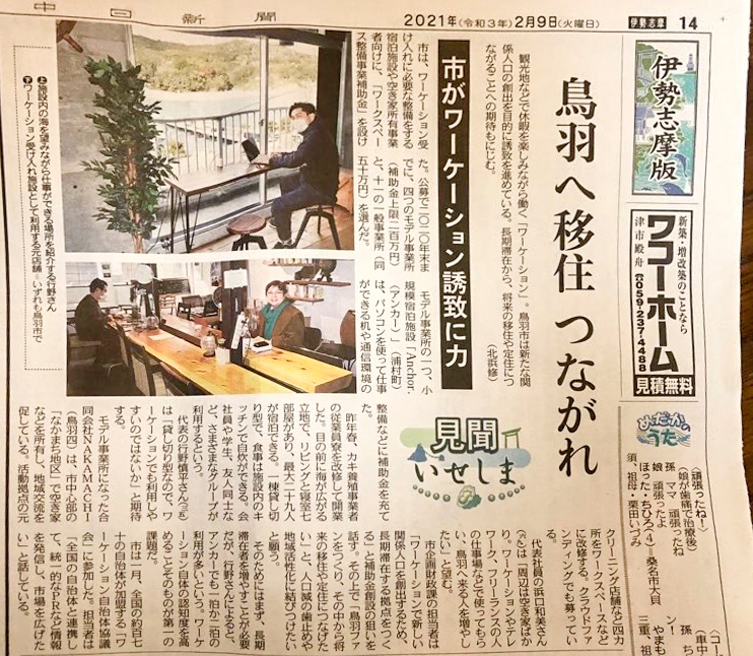 2月9日付にて「鳥羽へ移住 つながれ 市がワーケーション誘致に力」と題して、中日新聞さんに、鳥羽なかまちでの活動を取材、ご掲載いただきました。「中日新聞さんありがとうございます!大変、励みになります。」漁師の貸切アジトAnchor. 行野さん「貸し切り宿なので、ワーケーションでも利用しやすいのではないか」鳥羽なかまち 濱口「周辺は空き家ばかり。ワーケーションやテレワーク、フリーランスの人の仕事場などで使ってもらい、鳥羽へ来る人を増やしたい。」と、鳥羽市内各所で様々なアプローチでワーケーション整備が進んでいます。私たち鳥羽なかまちはもちろん、それぞれの施設がどんな風に変わっていくのか、とても楽しみです。