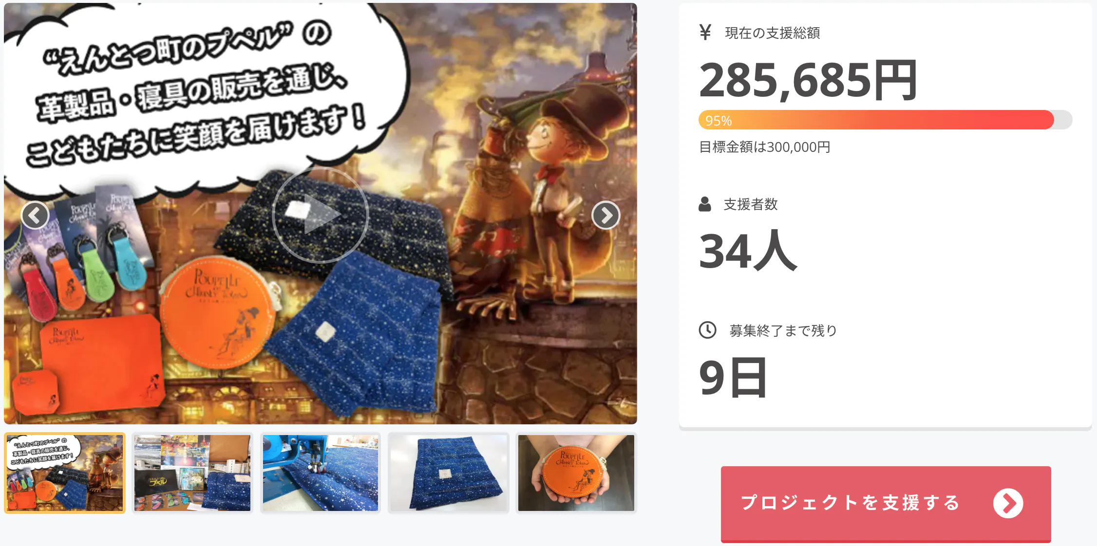 3月7日にスタートした「えんとつ町のプペル”の革製品・寝具の販売を通じ、こどもたちに笑顔を届けます!」に向けたクラウドファンディング、終了まで残り9日となりましたが、たくさんの方にご支援いただき本当にありがとうございます。