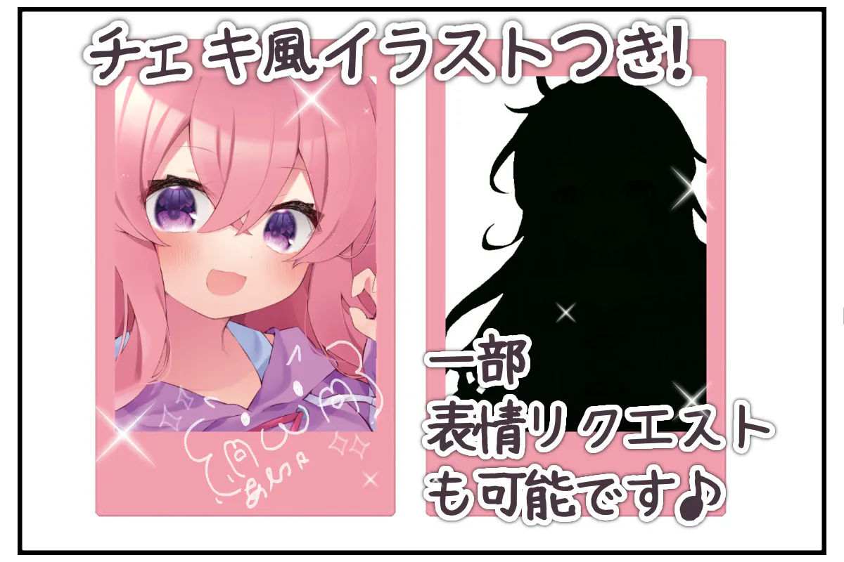 チェキプリンターを使用してイラストをチェキとして印刷します。一万円以上のリターンを選択された方のみ表情リクエストができます。備考欄に30文字以内で希望の表情を記載してください。