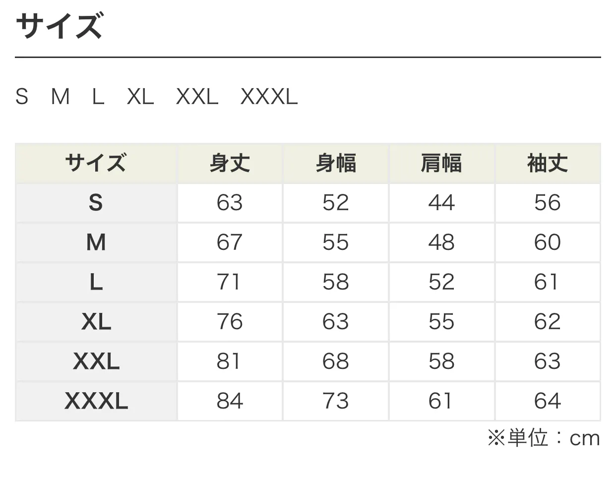 【 パーカーサイズ表 】