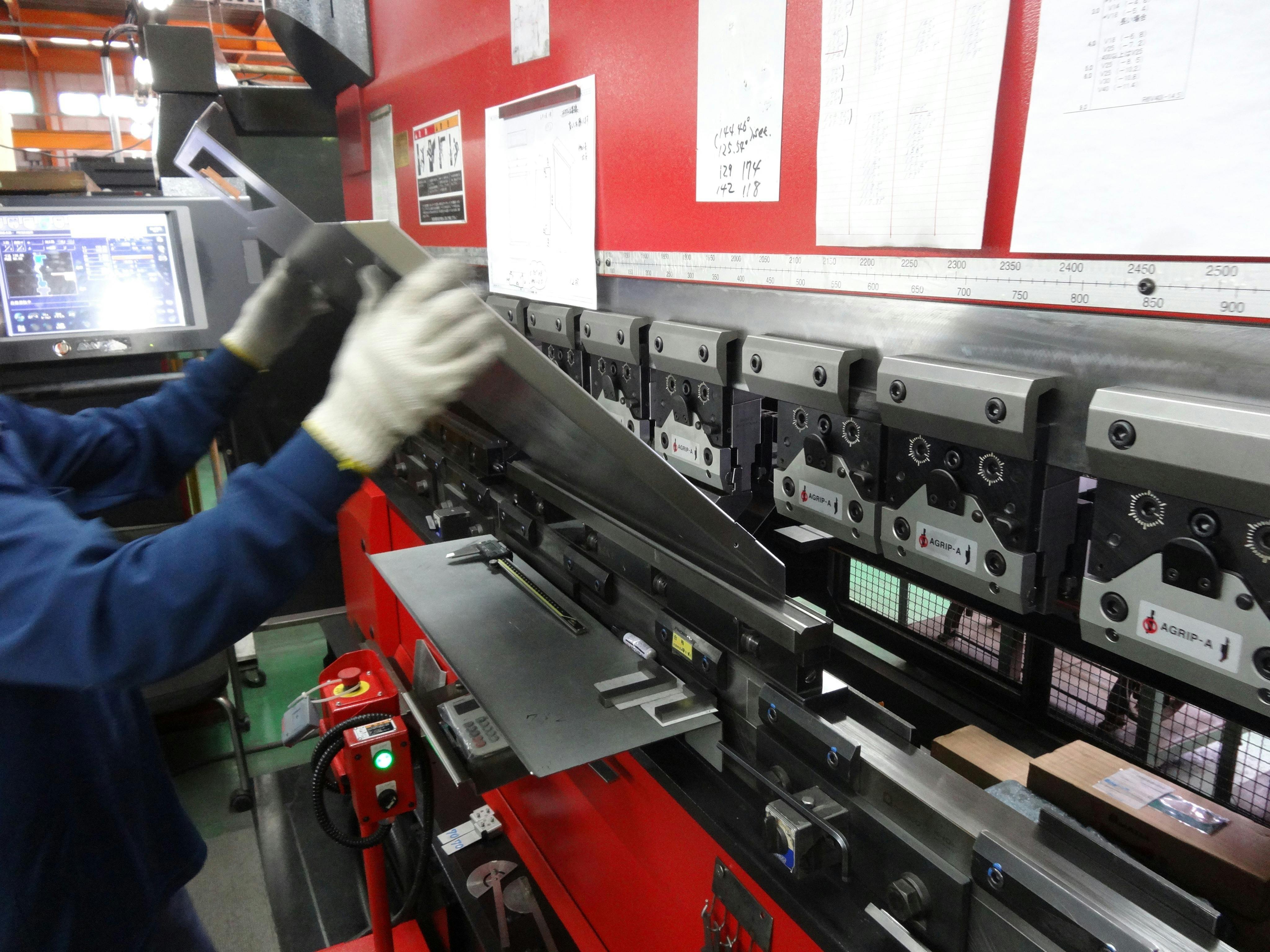 ノートPCフリースペーストレー「nosetty」はいわゆるハンドメイドでプレスして折り曲げています。全てを自動化したプレスではなく、職人さんが手でどれくらい曲げれば良いかを判断するので、経験と勘などが要求される緻密な作業になります。