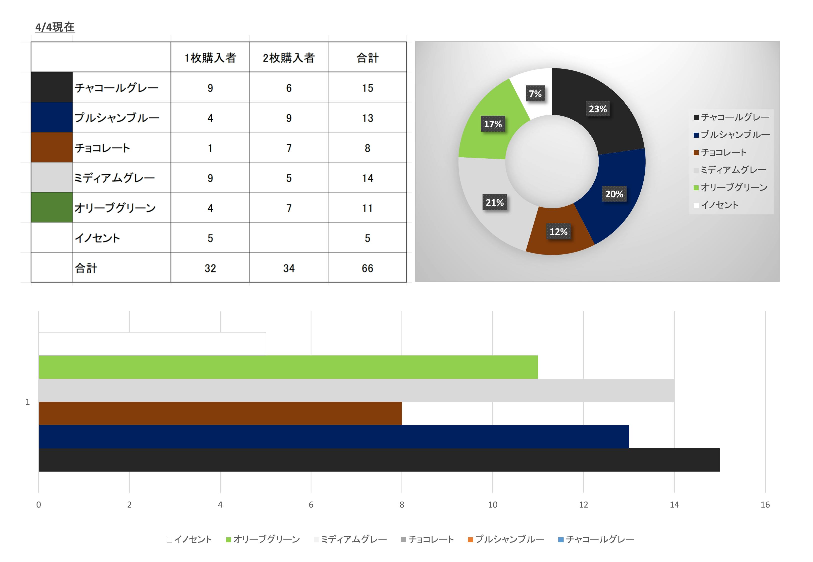 目標の50%を超えた時点の全5色(+未塗装1色)の選択色の傾向をまとめてみました。本日時点で52名の方に支援いただいており、そのうち2枚購入の方が19名。5色の分布は狙い通りほぼ均等でホッとしています。