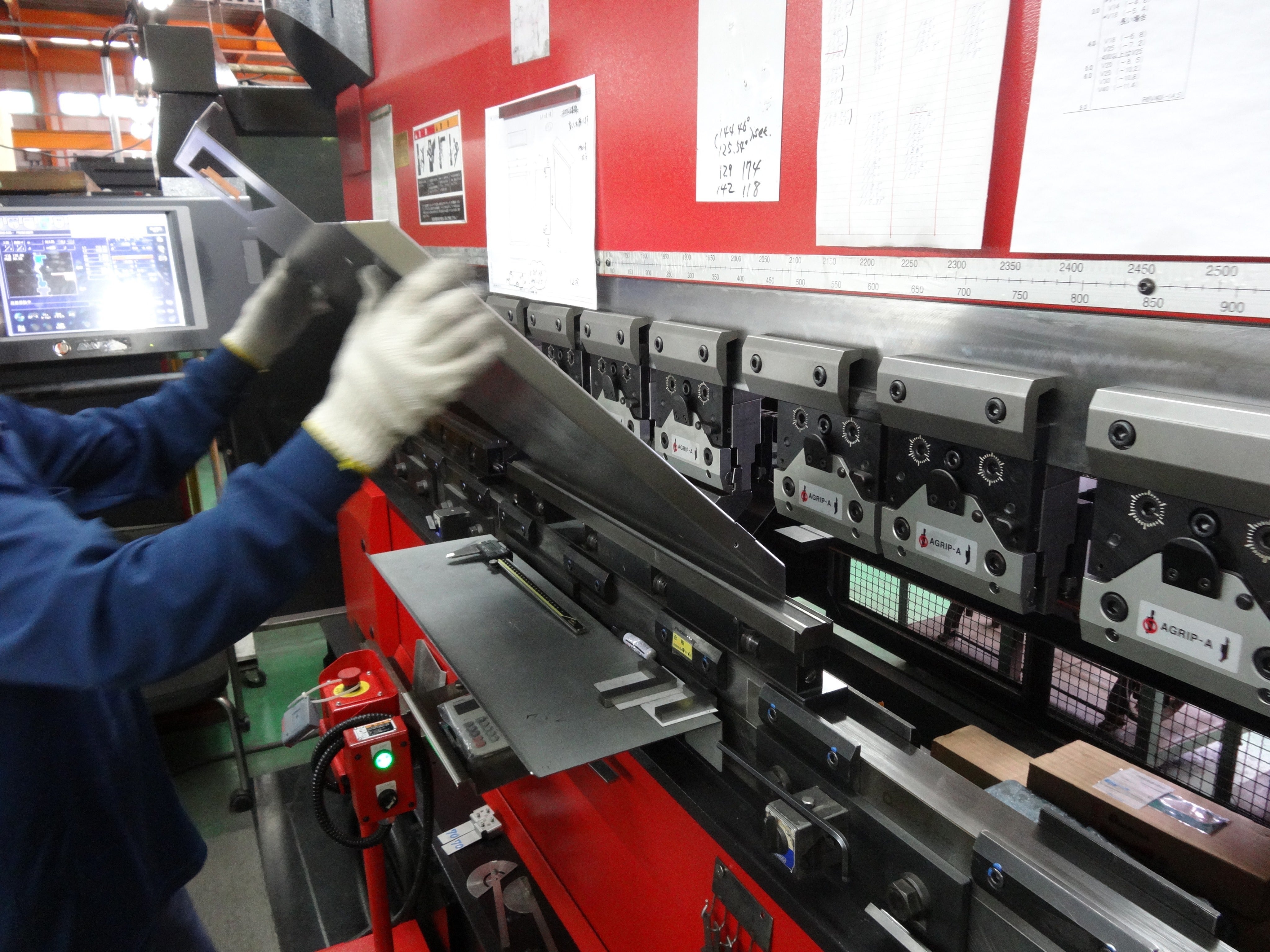 ノートPCフリースペーストレー「nosetty」はいわゆるハンドメイドでプレスして折り曲げています。全てを自動化したプレスではなく、職人さんが手でどれくらい曲げれば良いかを判断するので、経験と勘などが要求される緻密な作業になります。「nosetty」の製造工程は主に5つ1.元となる金属の板を選択し、折り曲げていない状態での板にカット2.カットした板のバリ取りを行い、表面を滑らかに研磨3.研磨した板を折り曲げるためのプレス用の型を使い、先端にアールをつけ曲げる4.できた板に塗装5.塗装した板にロゴを入れて完成このうち1から4までは今回ご協力いただいている五洋工業さんにお願いしています。まずは1.の工程ですが、保管されている様々な大きな金属板の中から今回のサイズに合う板を選択しています。その後、「nosetty」サイズにカットされた板の表面を滑らかにしていきます。この滑らかにする作業は重要です。表面が滑らかになると塗装ののりも良く、きれいな仕上がりになるからです。専用のローラーで均一にして、そのあとに研磨の機械により、表面を磨くとともにバリを取ります。出来上がった平らな板は、曲げるための型を使用し指定されたアールをつけるのですが、さまざまなプレス用の型の中で最適なものを選択します。そして最後に手作業で曲げていきます。この工程は職人さんの神業とも言える部分で、一定の力で3段階に分けゆっくりと板を曲げていきます。そのできあがりが全て同じアールが付き、高さも1ミリもずれずにできがあると感動ものです。皆様にはこの日本の職人さんの技術を経た「nosetty」をお届けしますので、どうぞお楽しみに。