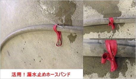 火災現場では、ガラスの破片や鋭利な落下物等でホースの一部が破れ漏水することがあります。伸縮性に優れたゴムバンドで圧迫することで防ぐことも可能です。