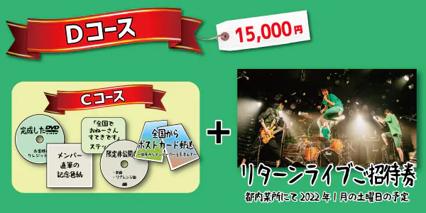 ★Cコースに加え、都内某所で行われるリターンライブのご招待券付コース。2022年1月の土曜日を予定しています。ライブに来るのがむずかしい方には、ライブ映像が観られるURLをお送りします。ダウンロードすればリターンライブがお家でいつでも見れちゃうネ!