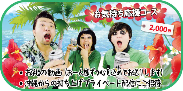 ★メンバーから心をこめてお礼の動画を送ります。また、最終日の沖縄より打ち上げプライベートツイキャス配信にご招待いたします。最後の夜、何が起きるのか?!ご参加しやすい金額でメンバーと打ち上げが楽しめるコースです。