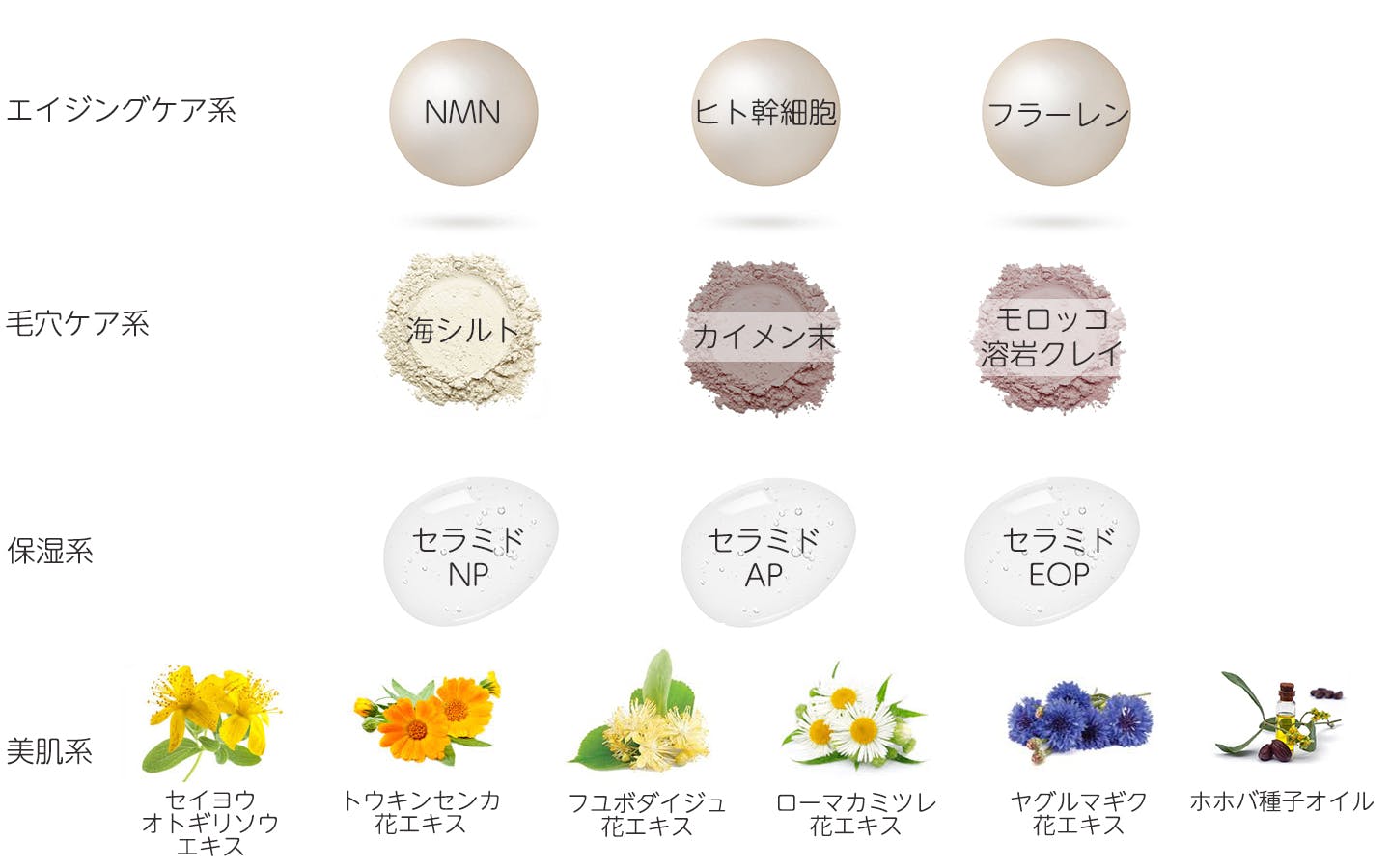 美肌系:ローマカミツレ花エキス、トウキンセンカ花エキス、ヤグルマギク花エキス、カミツレ花エキス、セイヨウオトギリソウ花/葉/茎エキス、フユボダイジュ花エキス、ホホバ種子油