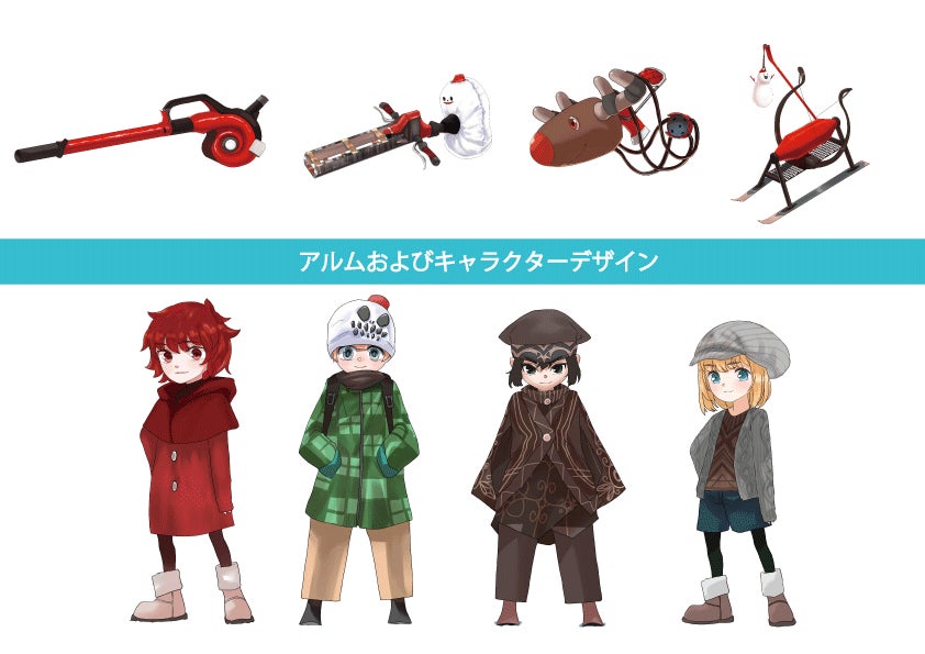 今作『スノースマッシュ・クラン』では表紙、キャラクターカード(12体)、アルムデザイン及びカードイラスト(8種類)、その他イラスト制作に必要な世界観、キャラクター設定などを行っています。