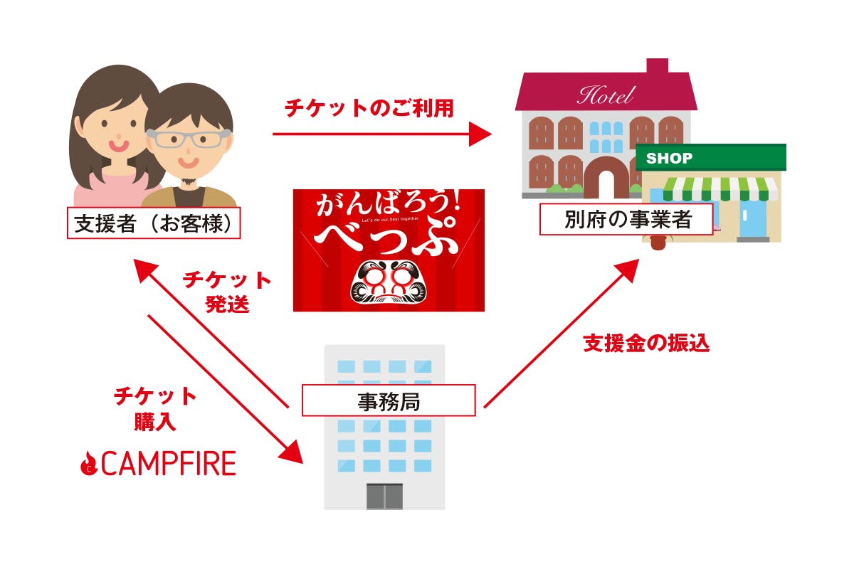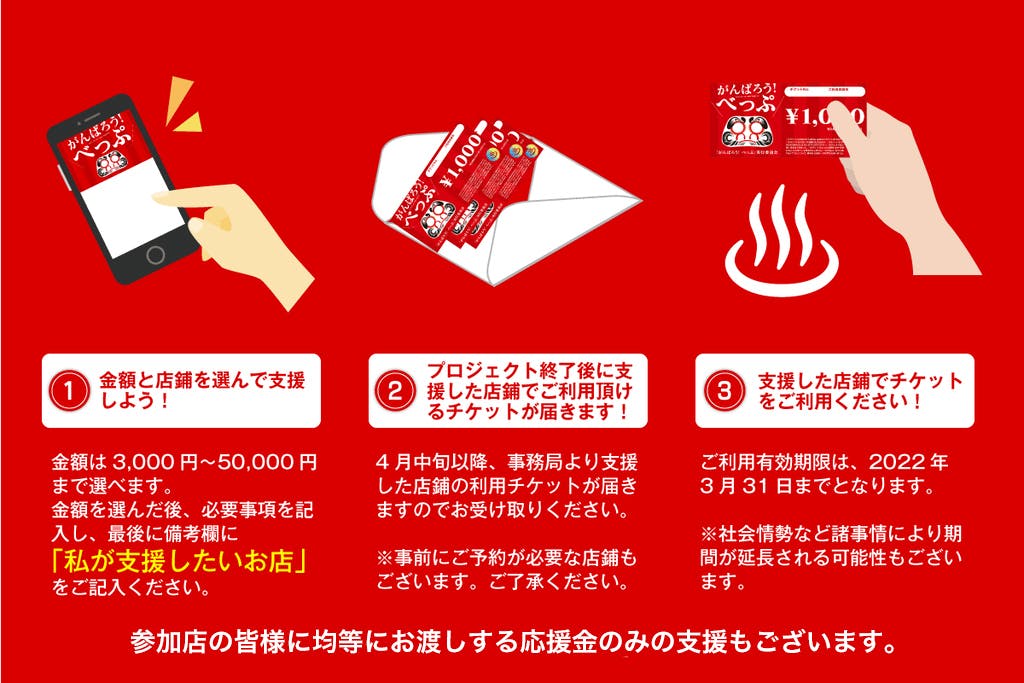 『がんばろう!べっぷ』プロジェクトは、『コロナ禍の逼迫した状況を乗り切る為には、いま一度みんなが一丸となり行動を起こすことで温泉観光地“別府”を灯し続けるというコンセプトのもと、別府にゆかりのある皆様方に別府の商店様の「前売りチケット」をご購入頂き、1日でも早く支援金を事業者様にお渡しする事で、資金繰りの支援を行うプロジェクトです。