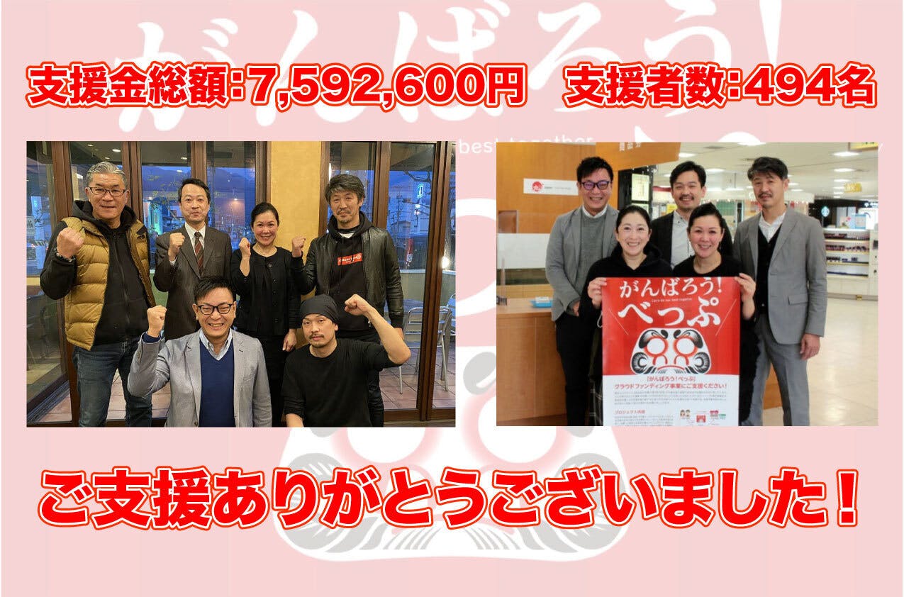 2021/03/04 22:11ご支援頂いた皆様へ!実行委員長の今長です。皆様のお陰様で494名の皆様から、支援金額総額:7,592,600円のお気持ちをお預かりする事ができました。心から感謝申し上げます。正直プレミアム付きチケットが出回っている昨今において、プレミアムが付いていないこのプロジェクトにここまで皆様のお気持ちのご支援をいただけるとは思っていませんでした。皆様の温かいお気持ちが本当に嬉しいです。現在店舗ごとの支援金額の集計作業を行っており、店舗様への支援金の受け渡しを来月上旬、支援者様へのチケット・リターン品の送付を4月中旬以降を予定しております。チケットの有効期限は2022年3月31日までとなっております。リターン品の送付までもう少々お待ちいただけると幸いです。メールでのご連絡で大変恐縮ではありますが、この度のご支援心から感謝申し上げます。皆様からお預かりした温かいお気持ちをしっかり店舗様へお届け致します。リターン品到着まで引き続き何卒よろしくお願い致します。がんばろう!べっぷ実行委員長 今長 学 もっと見る