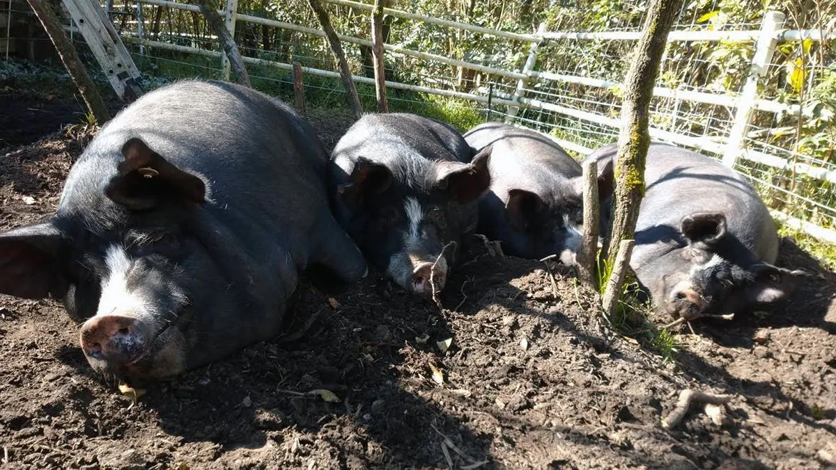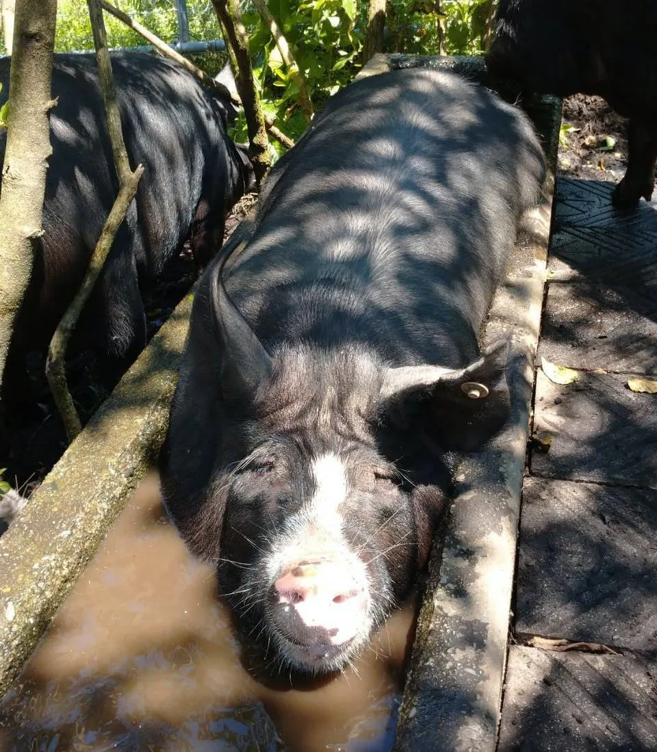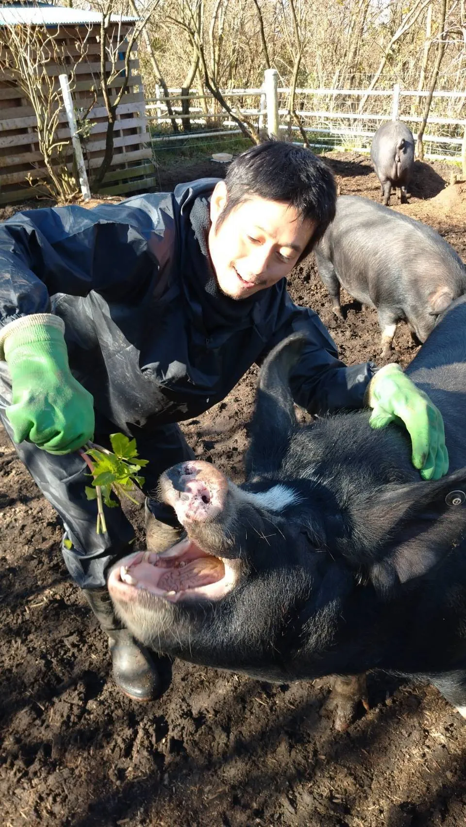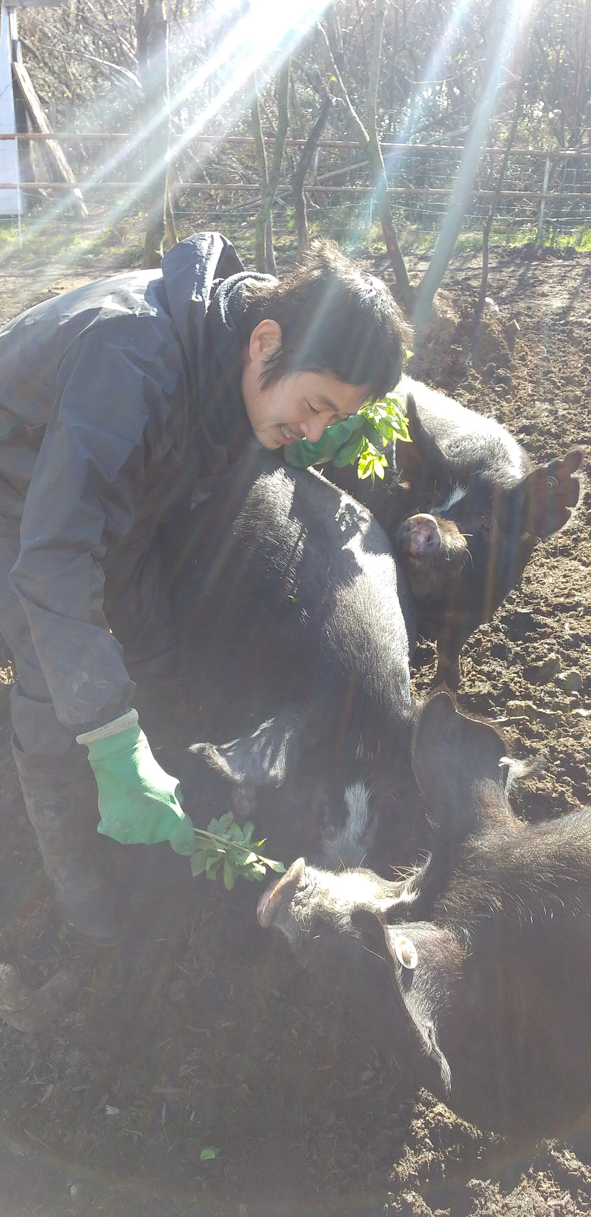 放牧飼育している豚は天気の良い日はよく日向ぼっこをしているので、干した布団のような優しい匂いがします。ミニブタの時期も可愛いですが、成長して100㎏を超える巨体になってもその可愛らしさは日々増すばかりです。豚が綺麗好きと言われる所以は寝床と食事場所とトイレを別々にする習性があり、体臭もないです。 飼育中に足を踏まれて悶絶しようが全然ヘッチャラです!
