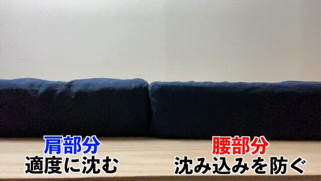 これにより、仰向きに寝ると腰が沈み込みすぎず、横向きに寝ると肩が沈んで、仰向き・横向きどちらに寝ても、綺麗な寝姿勢で、腰・肩の負担を分散します。