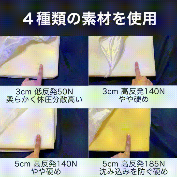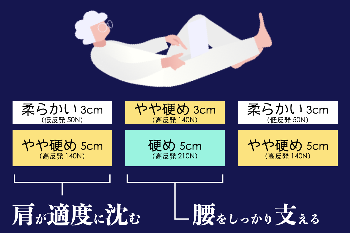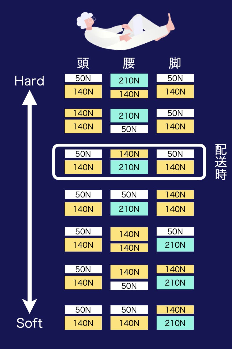 まずは配送時の状態で寝転がっていただき、柔らかいと感じた場合は硬めに、硬いと感じた場合は柔らかめに組み合わせを替えてみましょう。