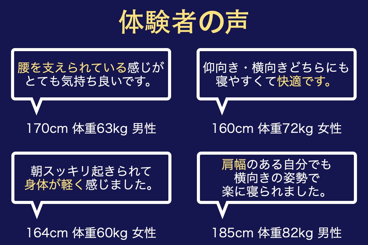 くじらマットレスの体験者からは「寝やすい」「身体が軽くなった」という声をいただきました。マットレスで寝ながら自宅で硬さをカスタムできる分、細身の方から、ガッチリ体型の方まで幅広くご好評いただいています。