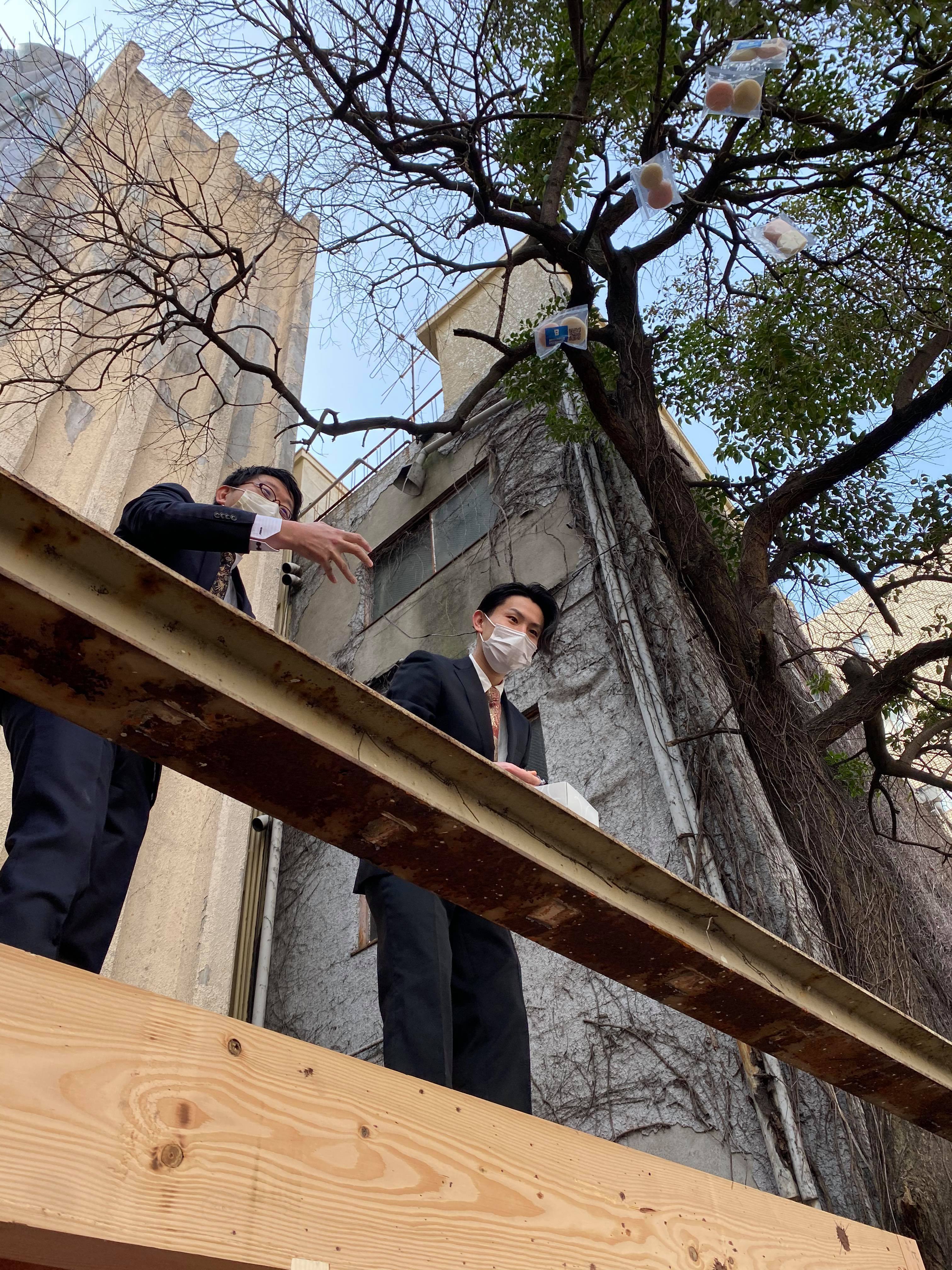 建物の上に上がってモチまき!