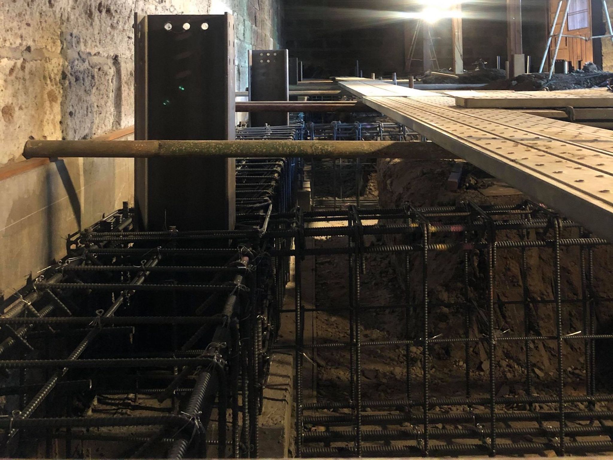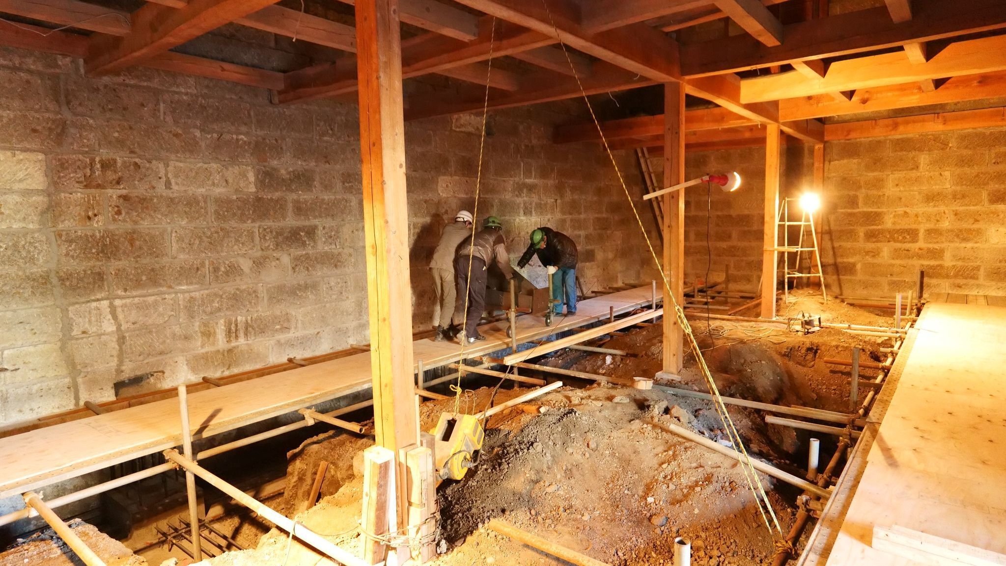 これから重たい鉄骨を立てていくので、床下に細かい鉄筋を入れて強度を上げます。床を剥がしたら、基礎にも壁面と同じ大谷石が使われていました。