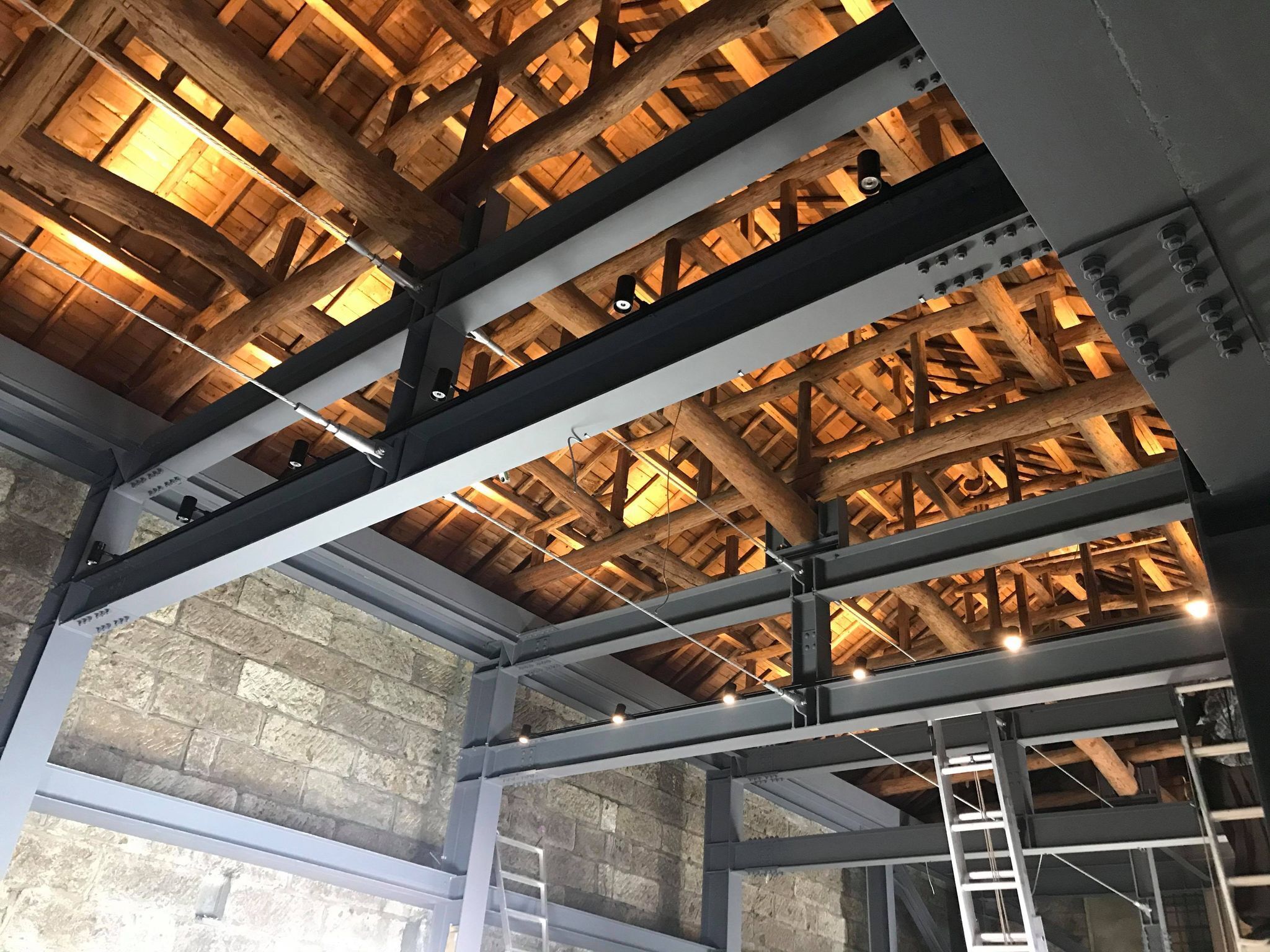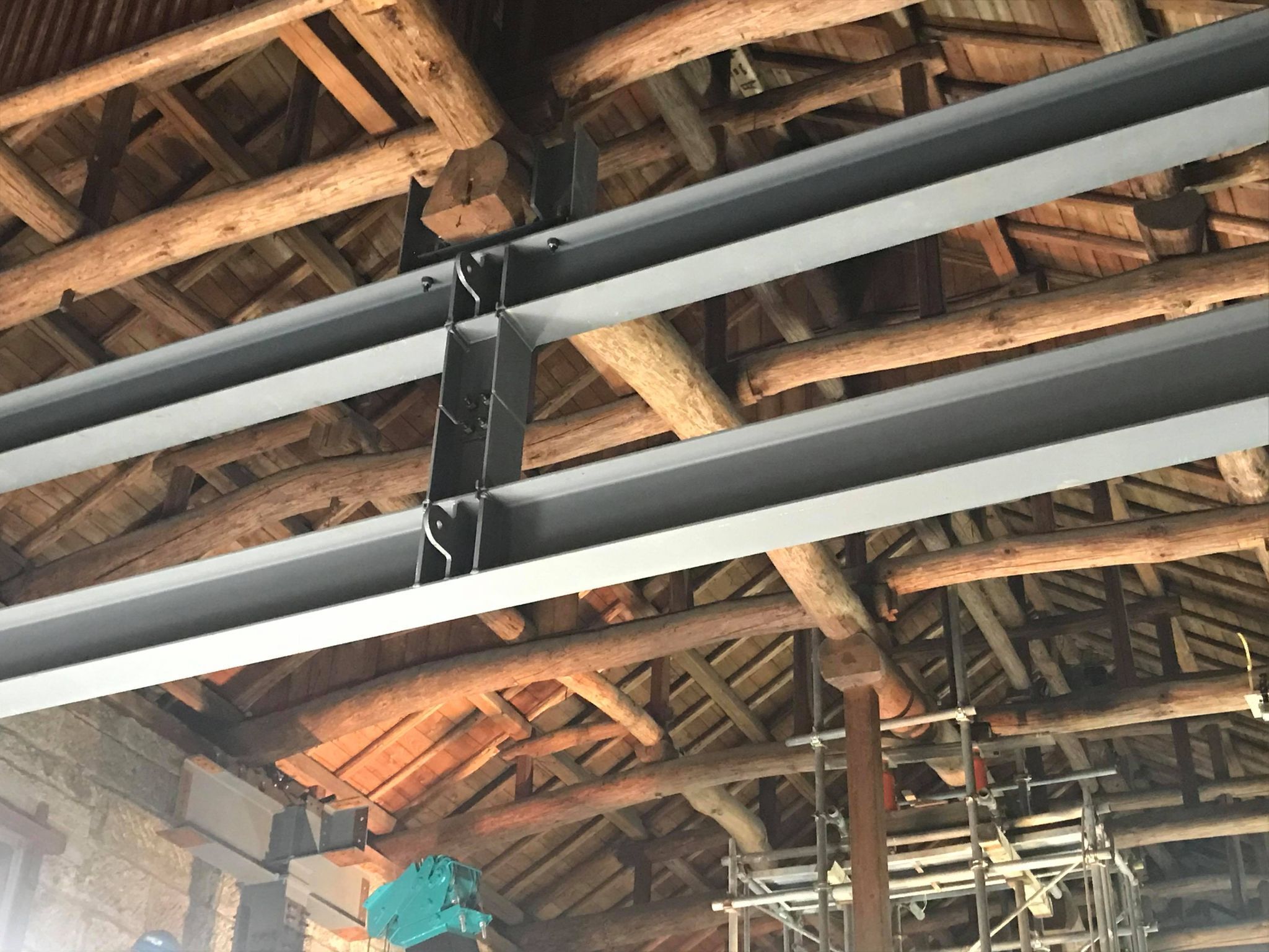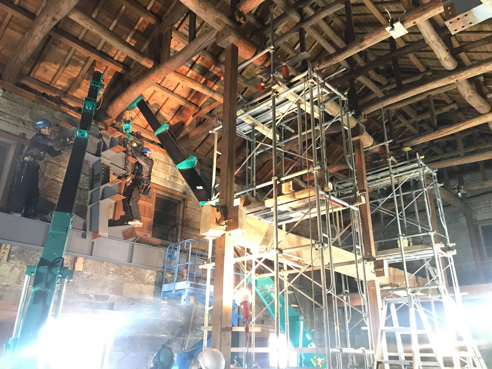 今まで木の柱や梁で支えられていた石蔵ですが、その柱や梁を一箇所ずつ外しながら大きな鉄骨を組んでいきます。