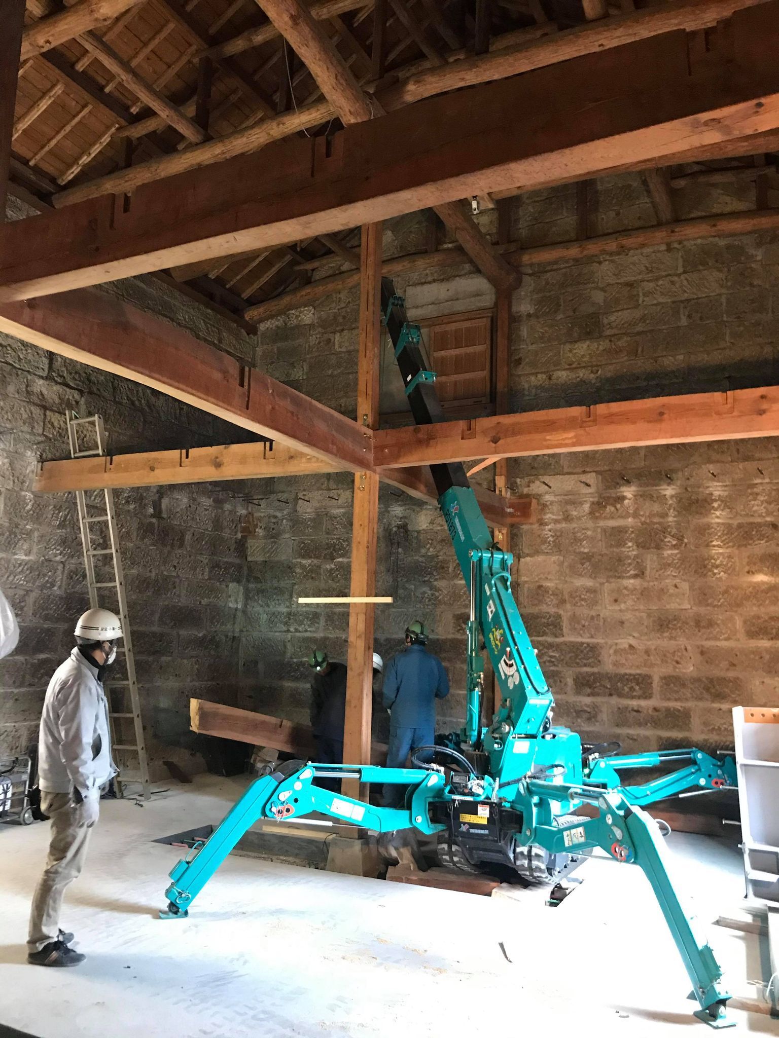 この石蔵は、以前の記事をご覧いただいたらよくわかると思いますが、入り口のサイズは人一人通れるくらいです。ここを通れるクレーンや材料しか使うことができないので、かなり難易度が高く、危険を伴う工事でした。