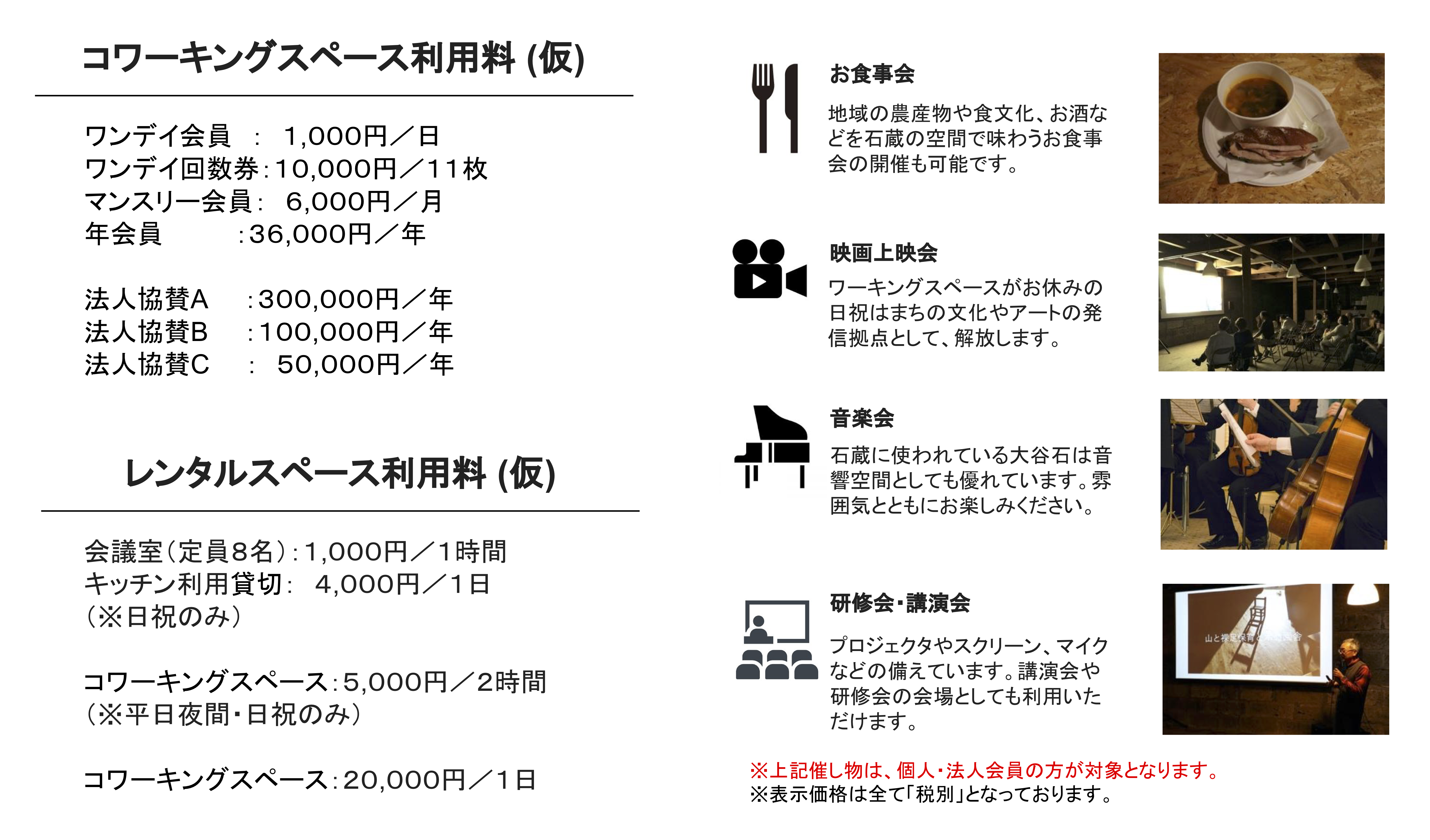 薪ストーブ床暖房を設置する石蔵コワーキングロビーは、「コワーキングスペース」と「レンタルスペース」の2Way利用で運営していく方針で考えています。