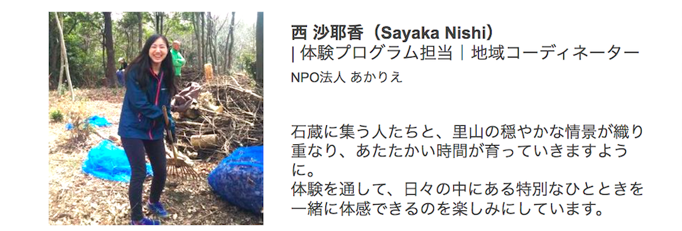 埼玉県の小川町で活動している「特定非営利活動法人あかりえ」の代表・谷口西欧(せお)です。