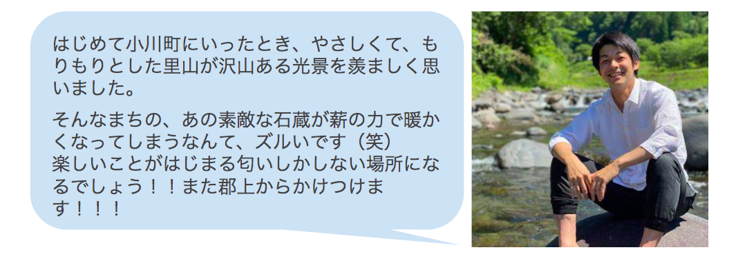 また、石蔵コワーキングロビーで町産材の薪を積極利用をすることで、町内での薪製造が活発になり、薪製造自体が町民の交流の機会になることも期待しています。