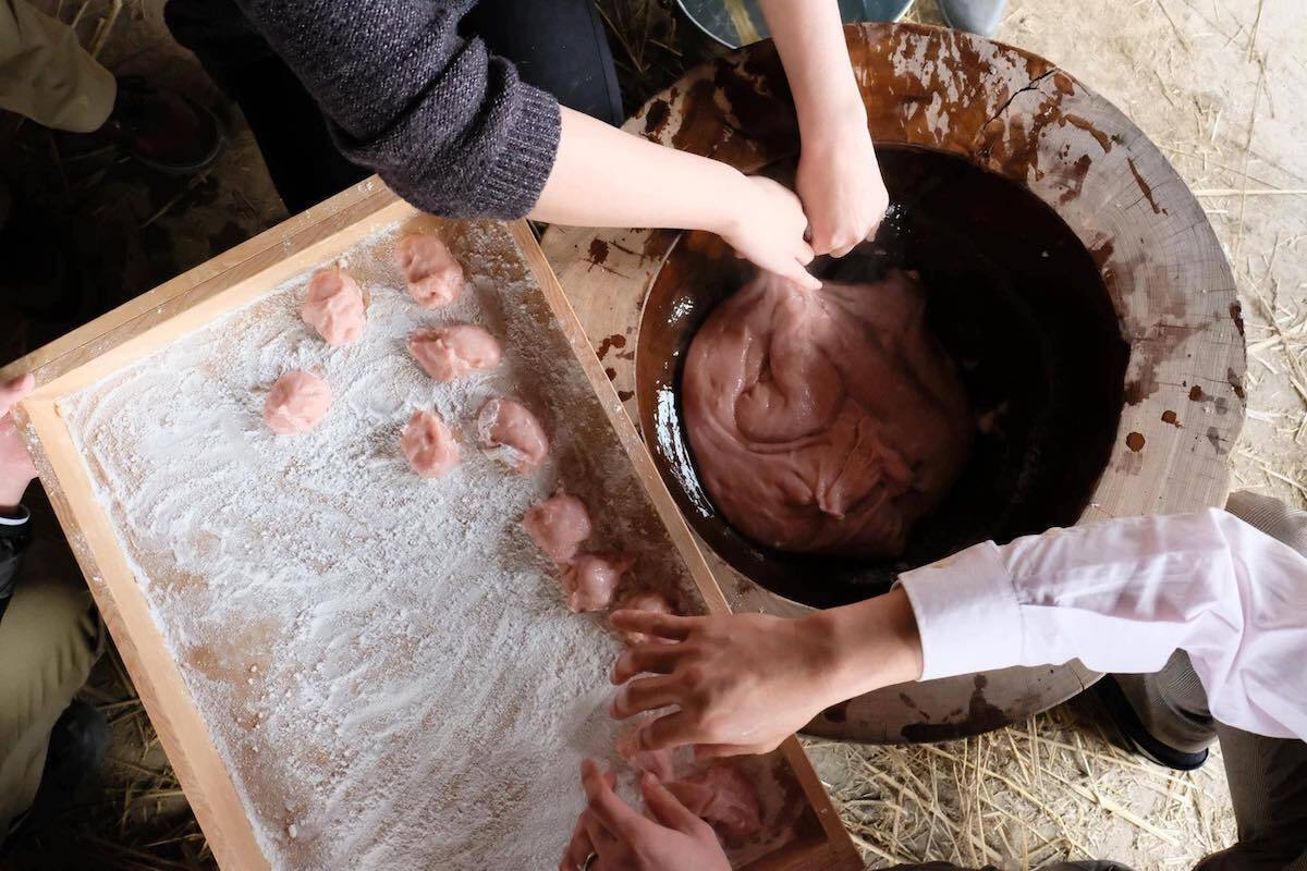 紅白餅のための餅つきの様子
