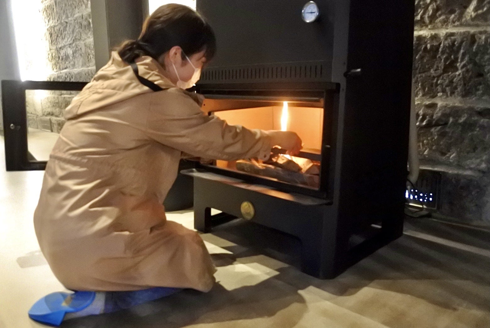 やはり、床暖房機能付きの薪ストーブ(今回石蔵に導入したのは、夢ハウスさんの『AURORA AQUA』というもの)を、このような広い空間で使用するのは珍しいことだそうで、ドキドキしながらのテストでしたが、無事、床もじんわりあたたまり、大成功でした!