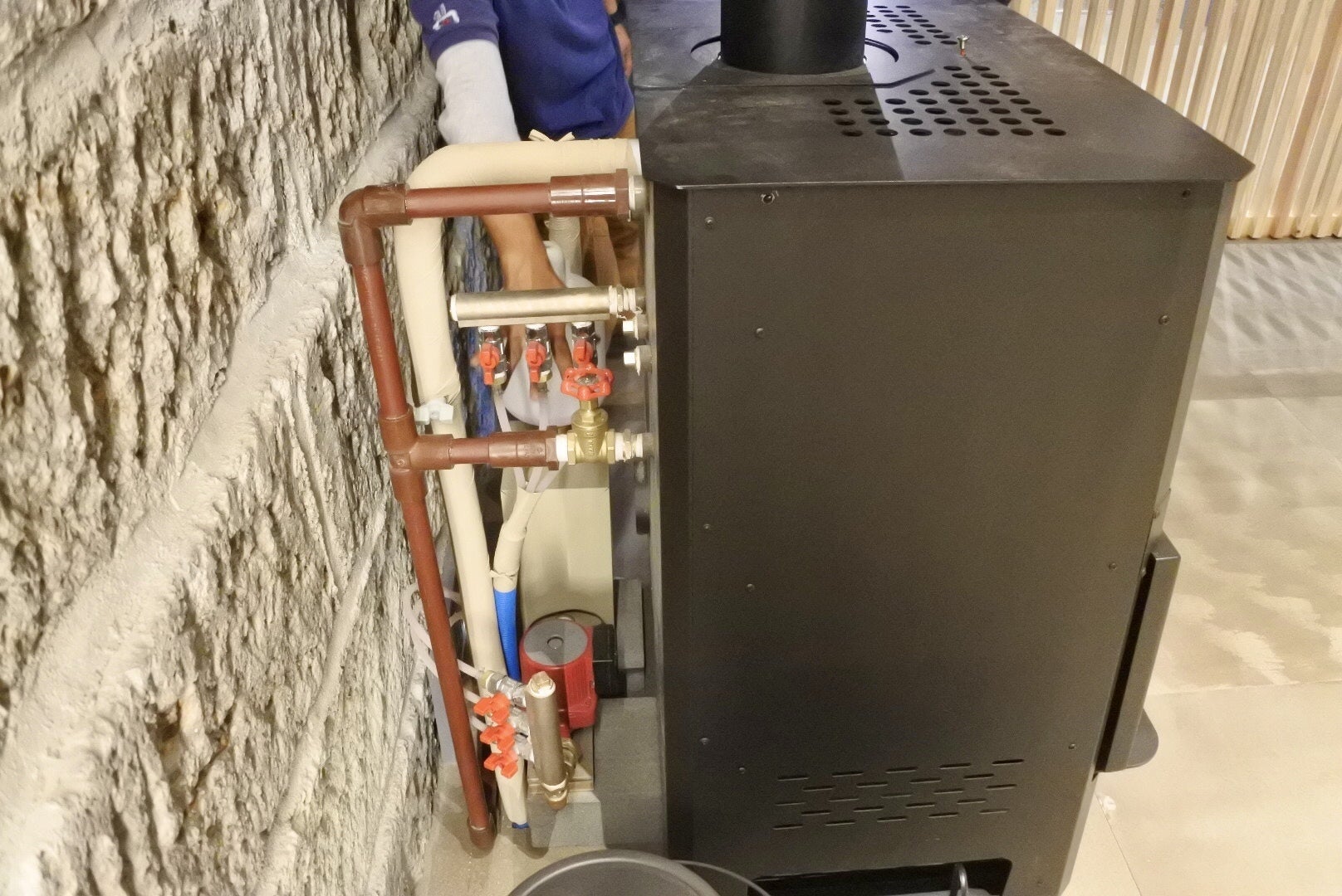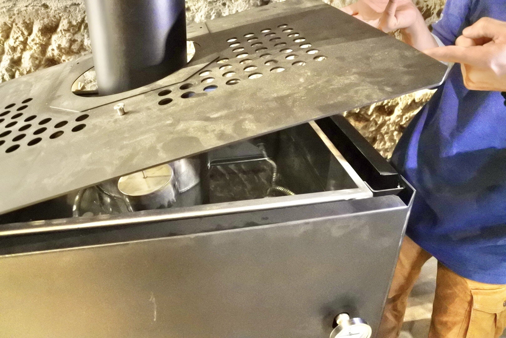 ストーブの上には、水のタンクがあり、ここで床下に流れていく液体を熱します。想像以上にたくさんの水が入っていますね。