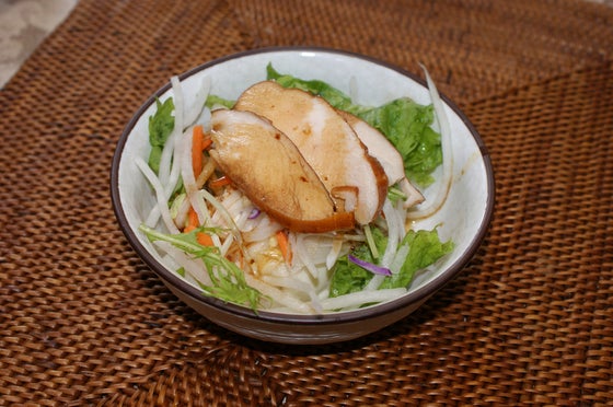 発酵タラ肝油しょうゆと合う料理をご紹介していきたいと思います。まず第一弾は、「スモークチキンと豆腐のサラダ」です。