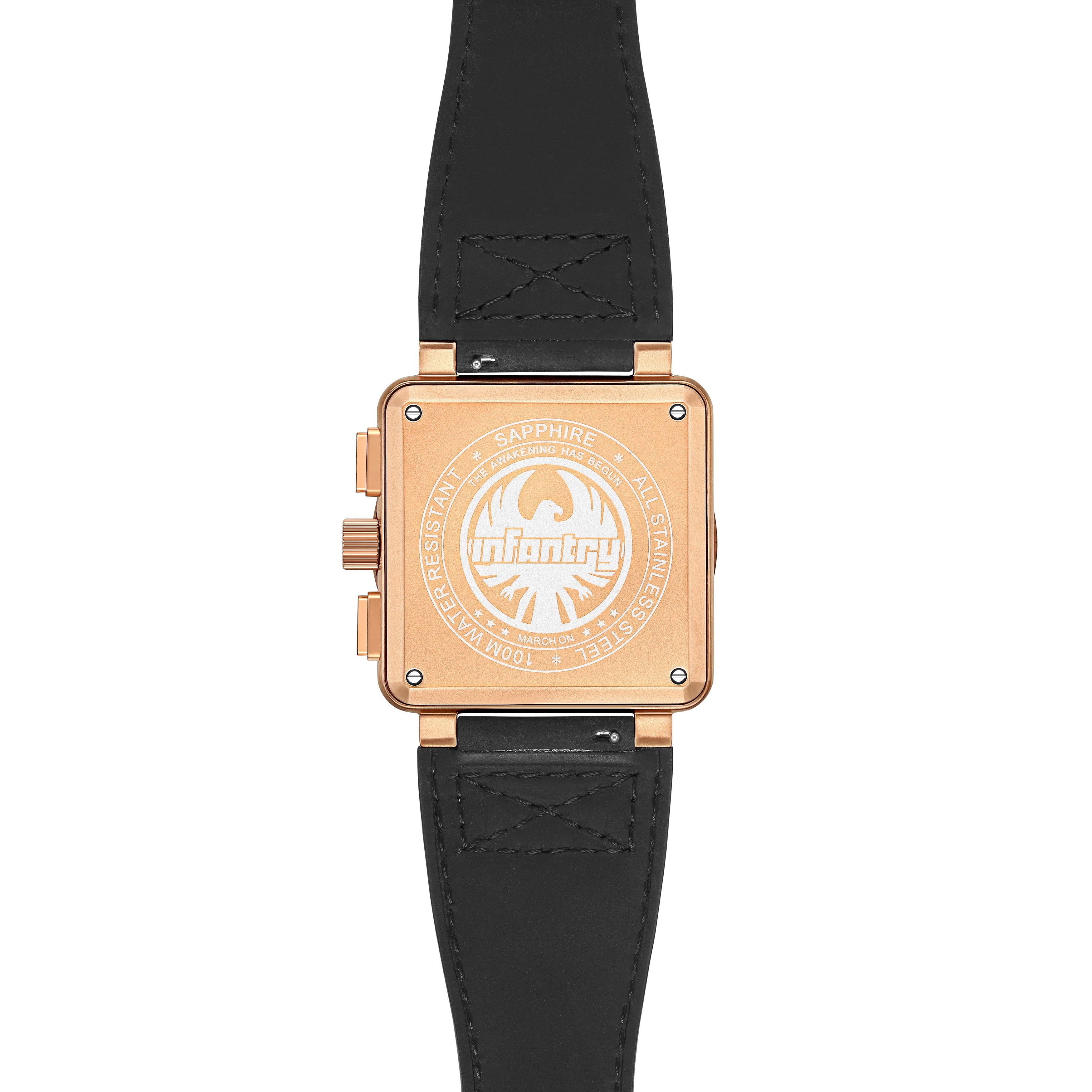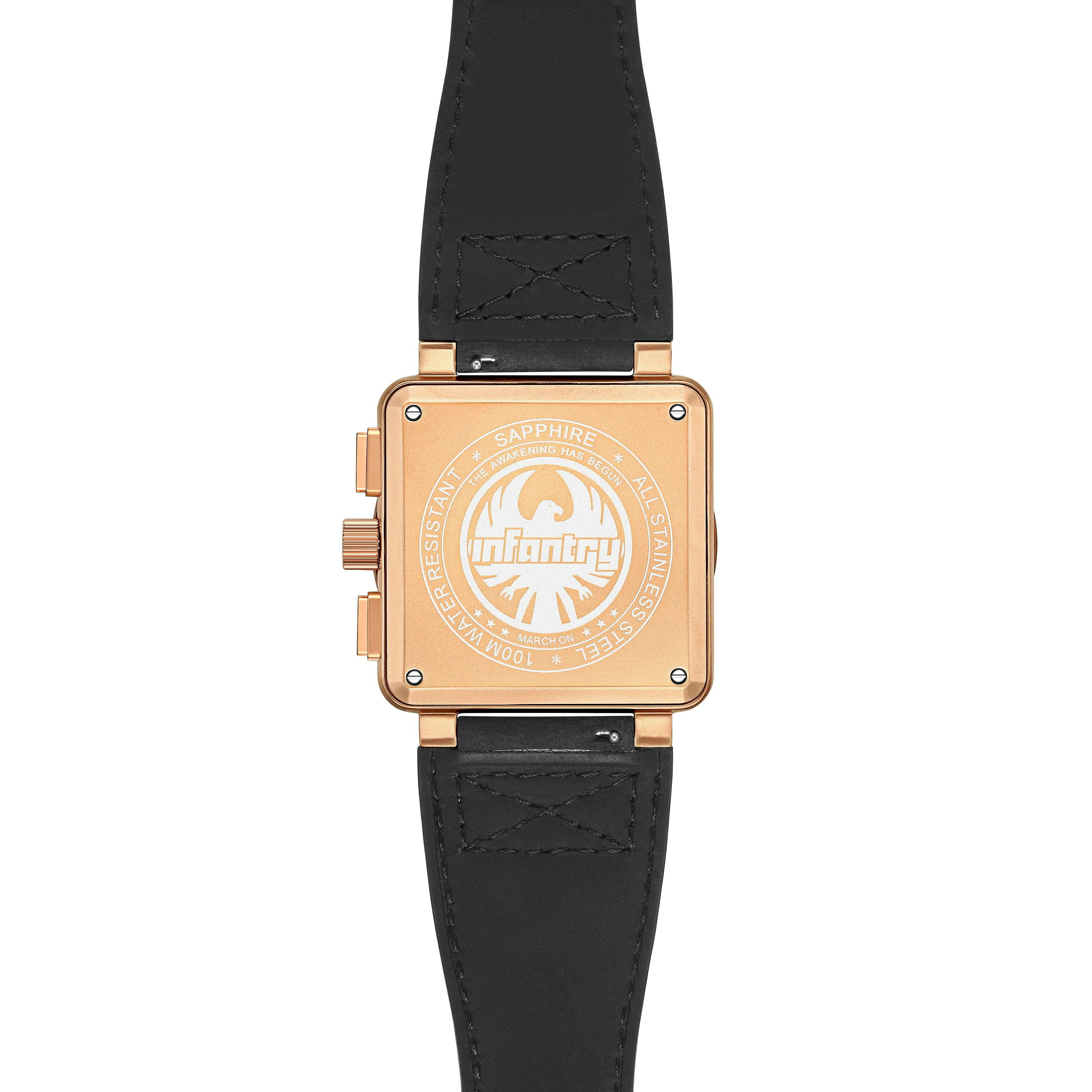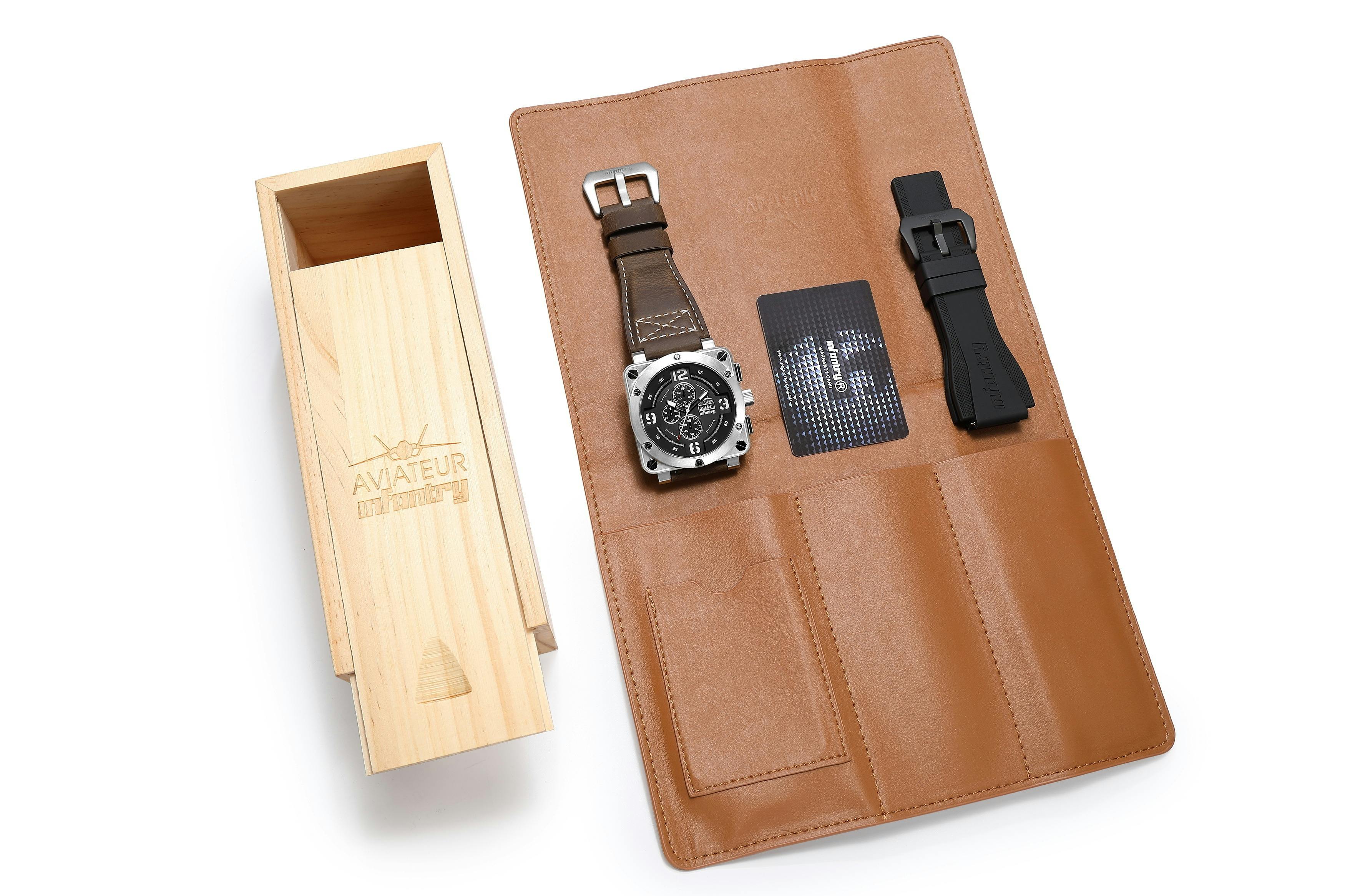 先行販売限定で下記の、木箱、Infantry特製腕時計専用ポーチ、交換用ラバーベルトをセットでお付けいたします!