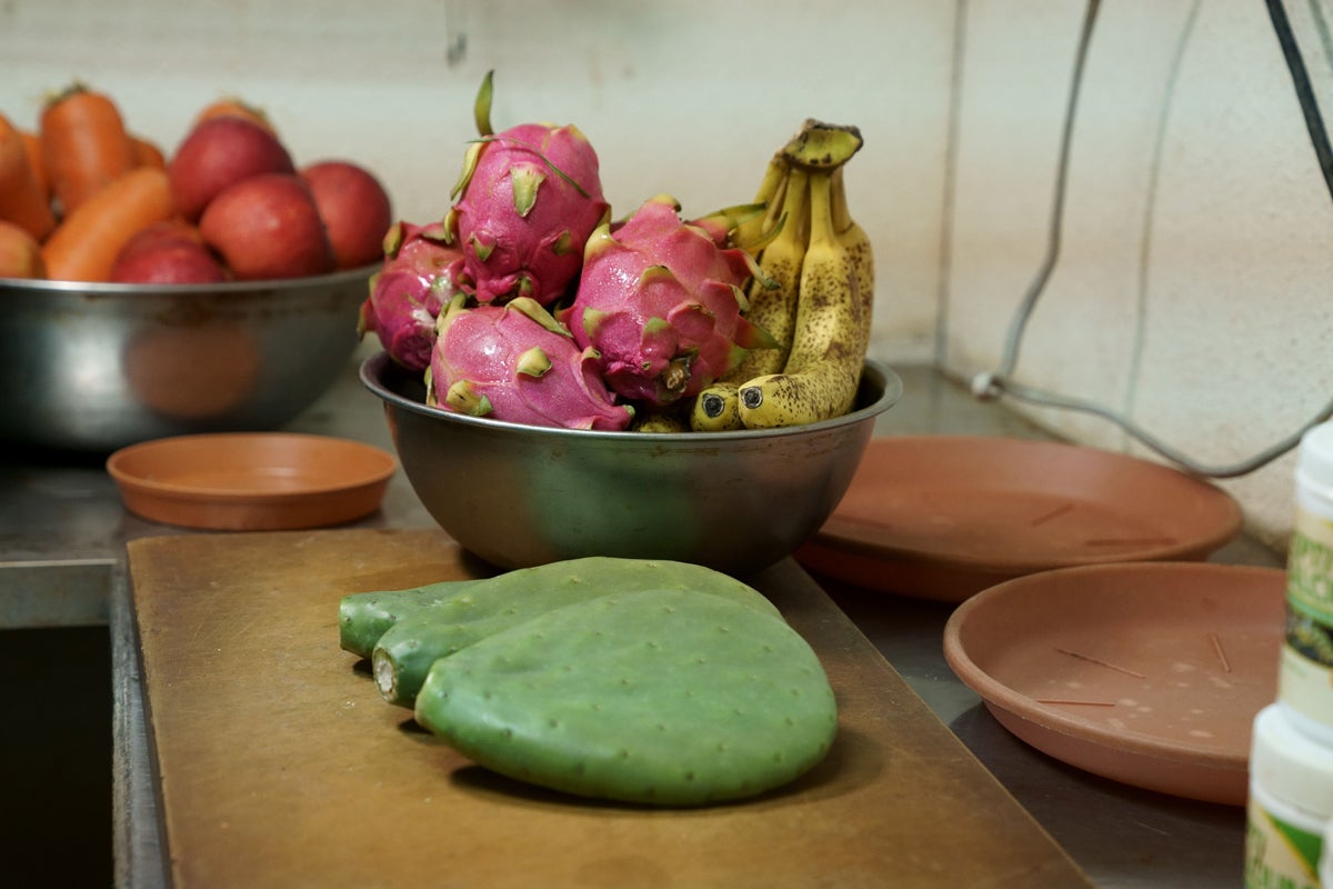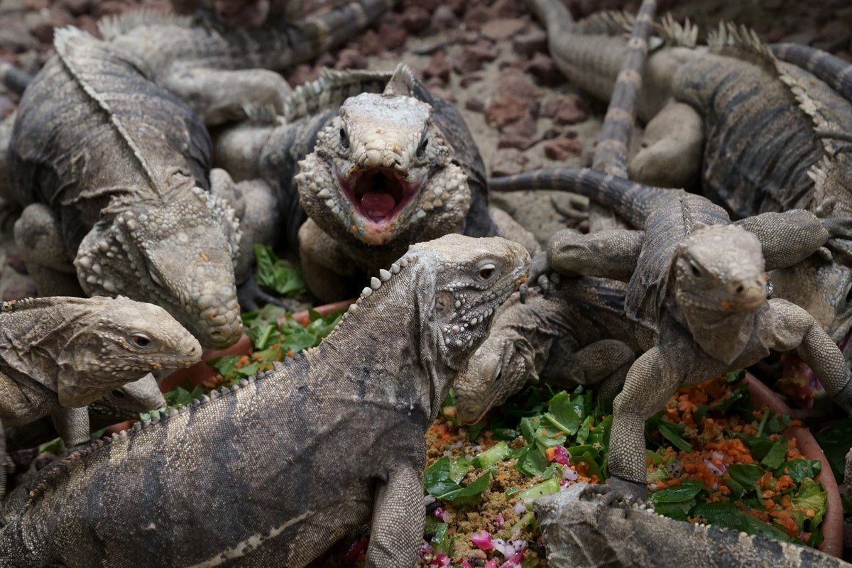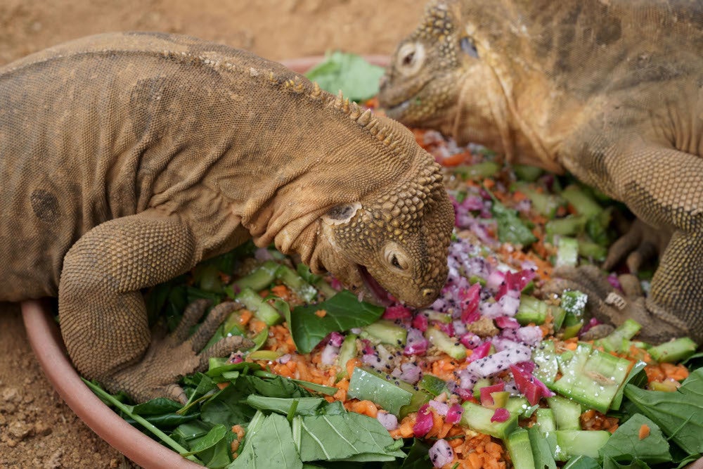 ガラパゴスリクイグアナは草食性。コマツナなどの野菜のほか、実験的にいろいろなものを与えるうちに、トゲが少なく栄養価の高いウチワサボテンが好物だとわかりました。