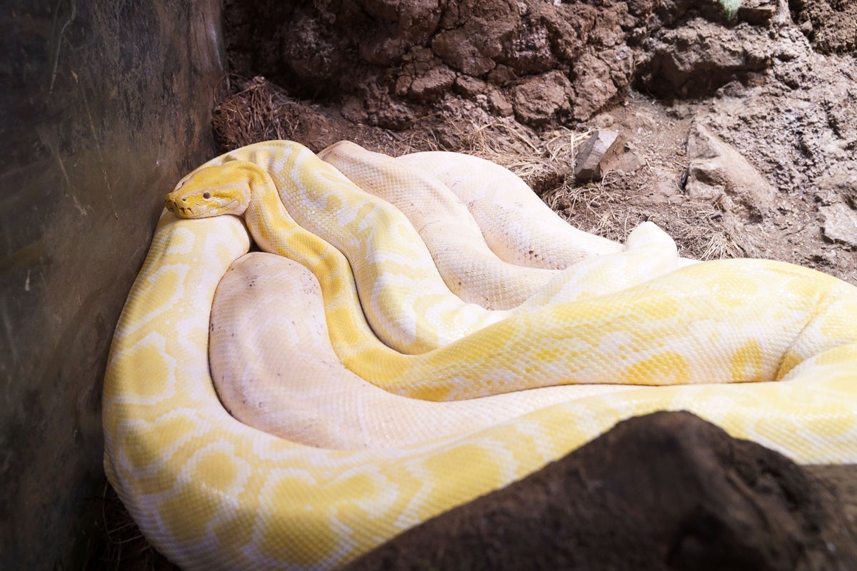突然変異で色素が欠乏したアルビノは、黄色いからだが特徴の人気者。ヘビに対して「ヌルヌルしてそうで気持ち悪い」という先入観を持っている方も多いですが、実際に触れると、ヌルヌルというよりスベスベした感触。お客さまからは「冷たくて気持ちいい」との声も。