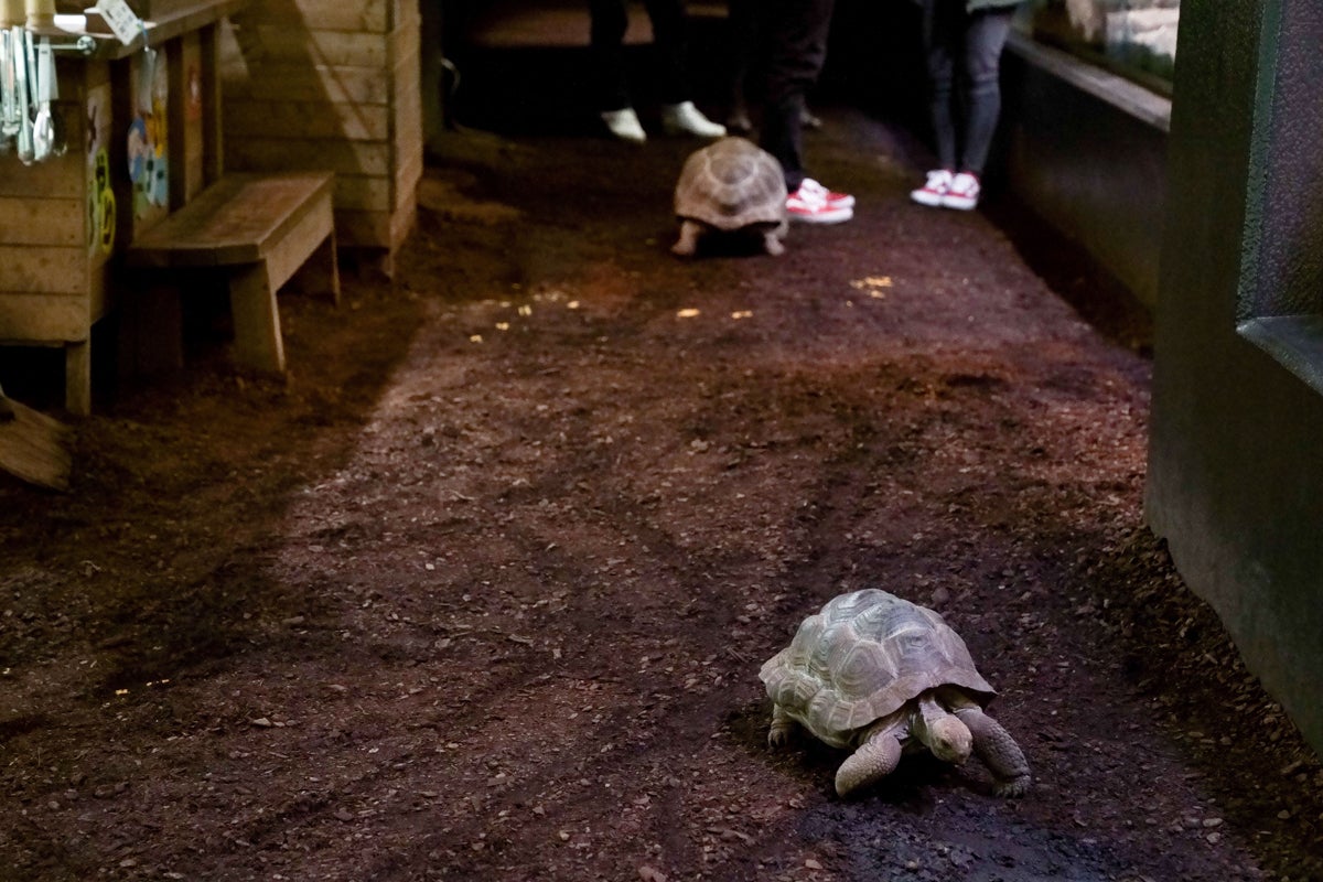 〝体感型動物園″とうたっているように、実際に動物とふれあえるのがiZooの大きな魅力です。館内は温度も湿度も高めに設定し、床にはウッドチップを敷き詰めています。人間にとってはジメジメと少し蒸し暑く感じますが、爬虫類に最適な環境を保っているのです。足元をゆっくりゆっくり進むリクガメにつまずきそうになったり、木の枝の影にひっそりと隠れるトカゲを探したり……。まるで本物の森の中を歩くように、ワクワクする感覚を味わっていただけます。