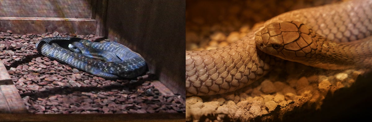 iZooで展示する爬虫類の中には、猛毒を持つ危険な種類もいます。〝世界で最も危険なヘビ″といわれるブラックマンバやキングコブラの毒性はすさまじく強く、万が一でも噛まれたら絶対に助からないといわれるほど! 週1回のえさやりも、油断は禁物。危険が伴うので、ヘビの習性を熟知している白輪園長が担当しています。「人間に慣れず、一歩間違えば命の危険があるところが魅力です(笑)」(白輪園長)