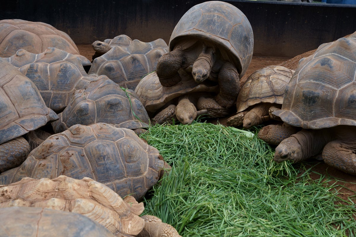 アルダブラゾウガメは、1頭当たり毎日10㎏のキャベツやコマツナ、ニンジンなどを食べます。当園で飼育するゾウガメ全体では、毎日トラック一台分以上の野菜をあげています。