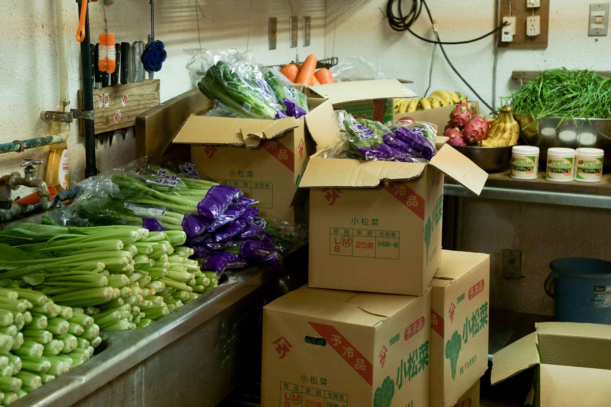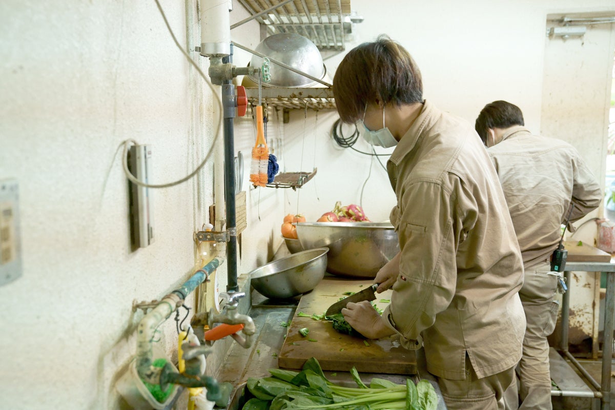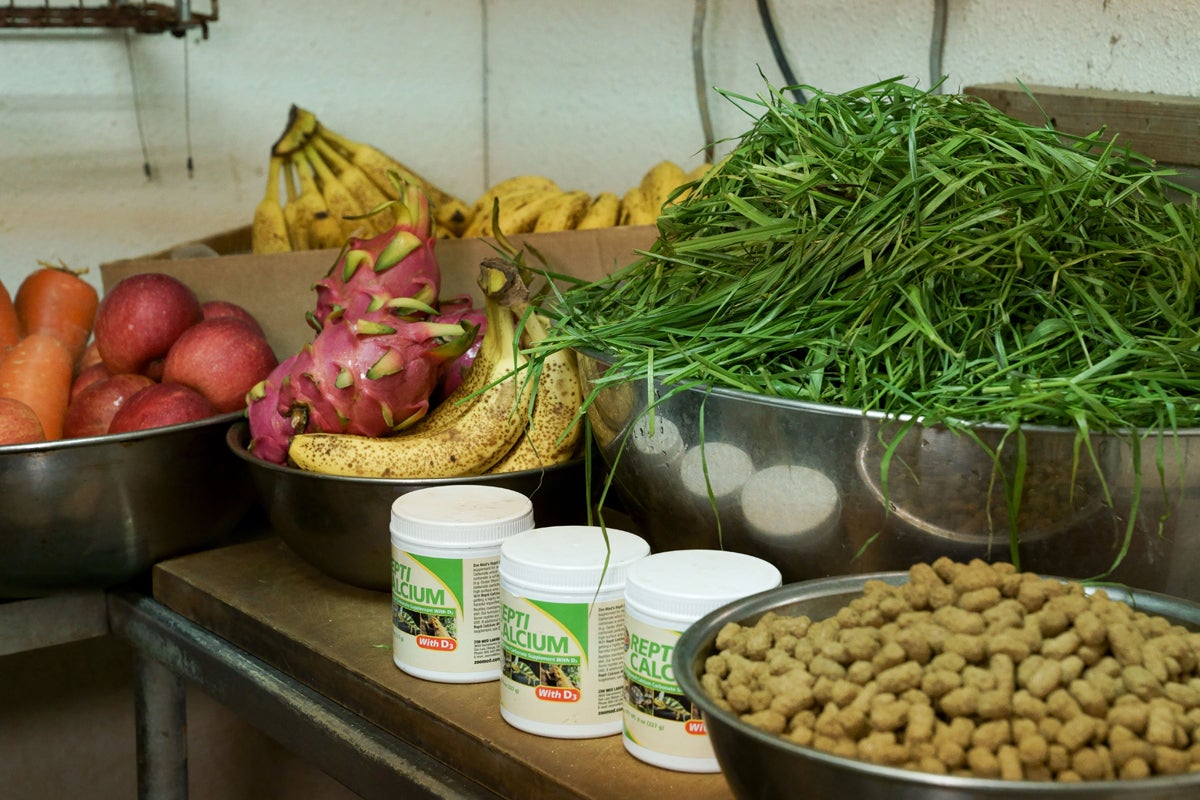 飼育スタッフの朝は、大量の野菜をひたすら切ることから始まります。毎日、えさをあげるのは植物食性のリクガメやイグアナ。野菜を中心にコマツナ、ニンジン、リンゴ、ドラゴンフルーツ、マンゴーなど。春から夏にかけてはタンポポやクローバーなどの野草、牧草、夏にはスイカ、秋にはカボチャと、季節によって栄養価が高いものをミックスします。牧草は毎日約5㎏、野菜はダンボール8箱分で、80~100kgを与えています。またトカゲは、コオロギなどの昆虫、ヘビやワニ、オオトカゲは肉食性で、ネズミやトリ肉、魚を食べます。