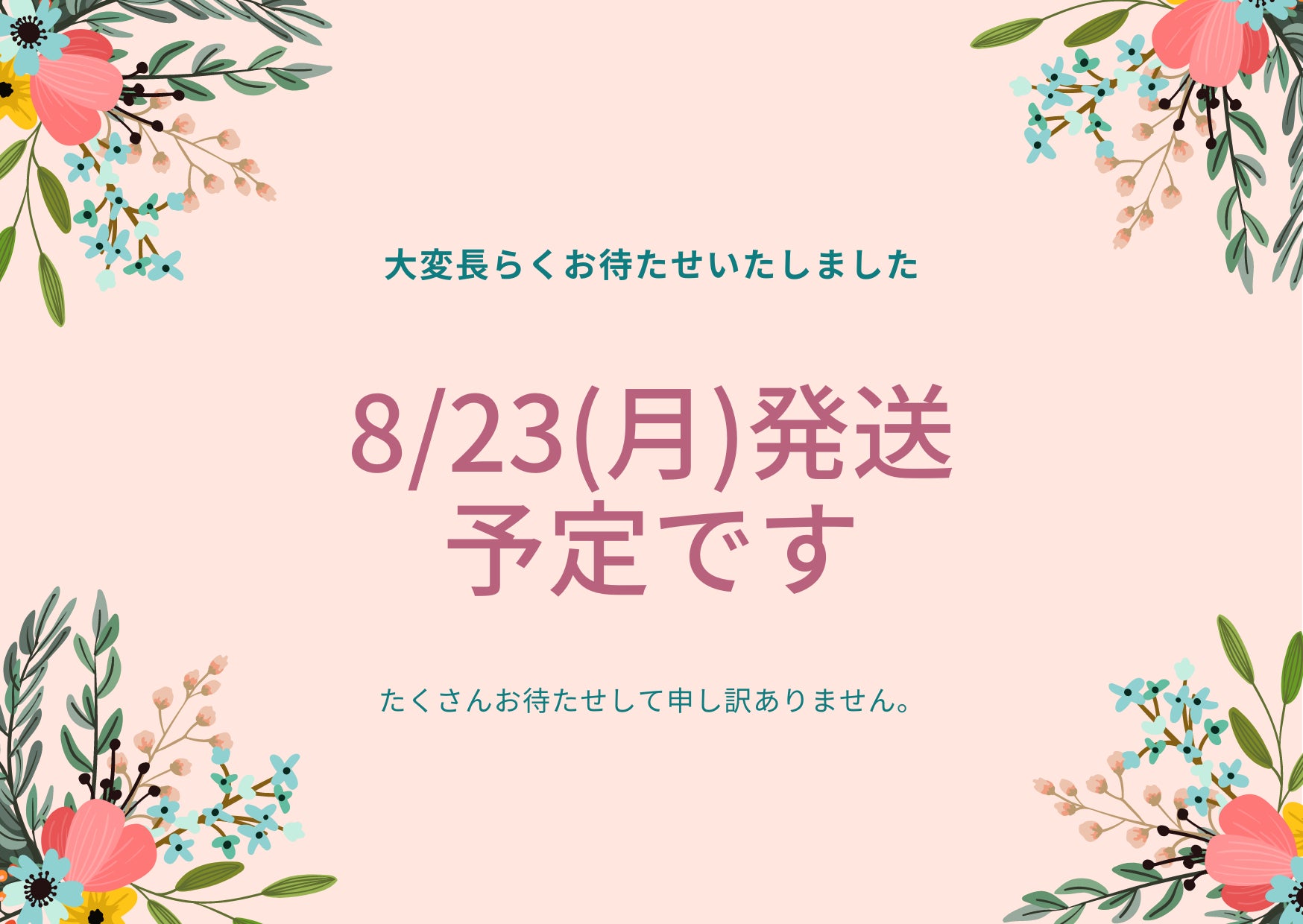 万一、購入時点から住所が変わられた方がいらっしゃいましたら8/23(月)朝10時までにメッセージにてご一報くださいませ。新しい住所に発送いたします。