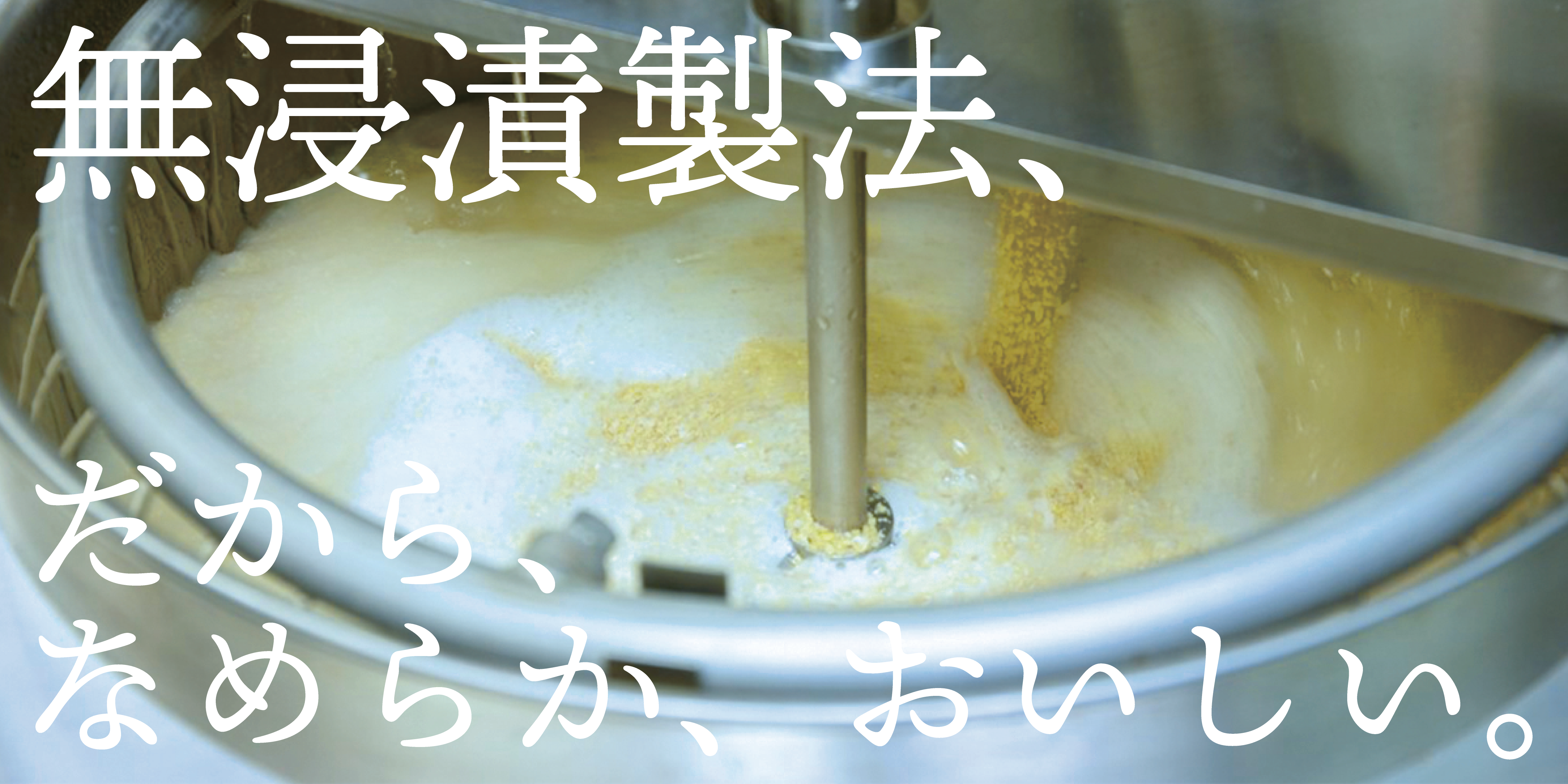 20時間以上大豆を漬けると栄養分が融け出し、大豆が酸化、鮮度と風味が落ちてしまいます。靖一郎豆乳の製法では、大豆を砕き、脱皮させることで大豆を漬けずにつくることが可能です。これにより、大豆の栄養分を逃がすことなく、酸化を防ぎ、コクの深いまろやかな豆乳をつくりだすことに成功したのです。