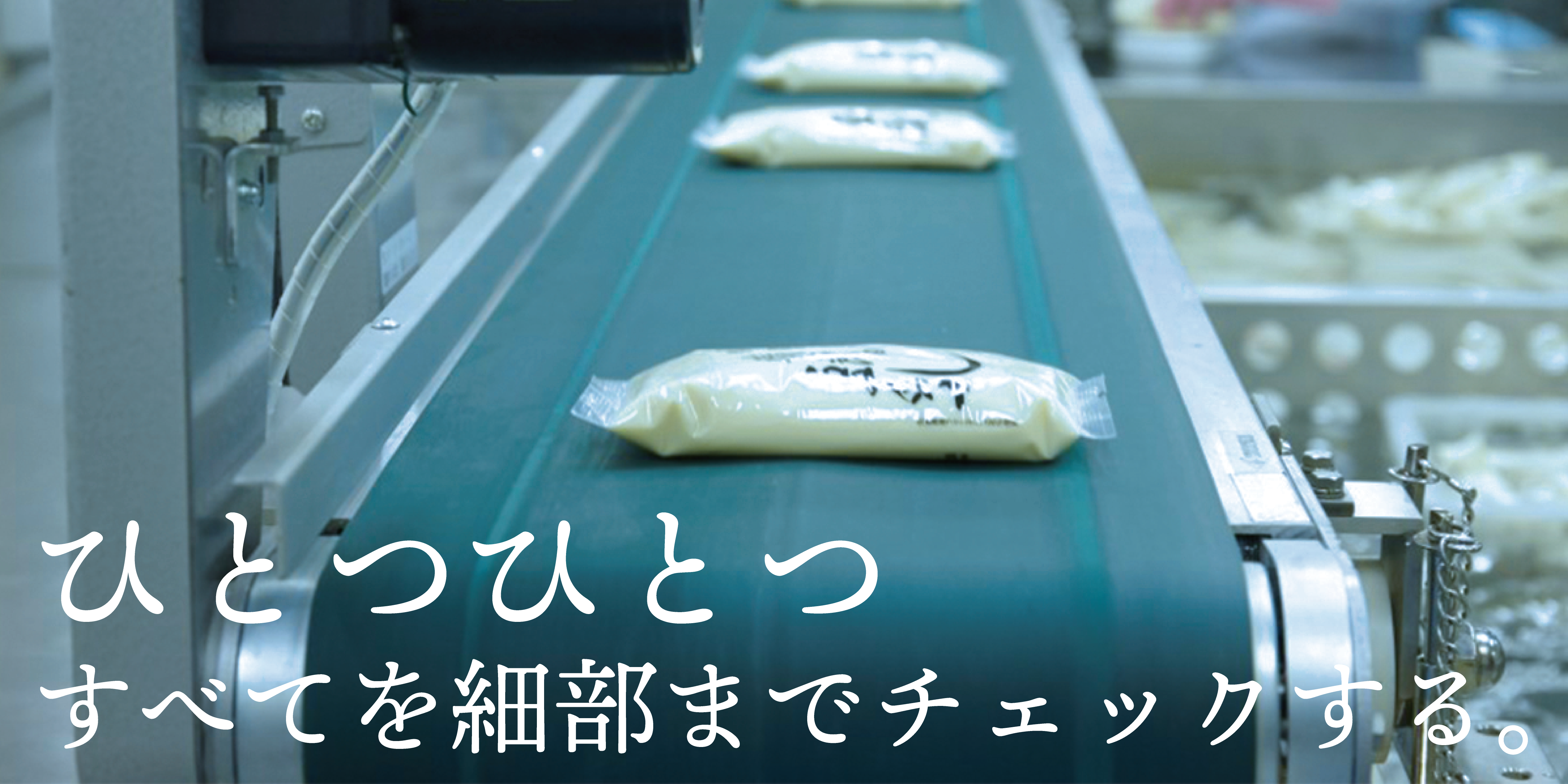 靖一郎豆乳は製造されたすべての個体をかならずひとつひとつ丁寧にチェックしています。重量、温度、濃度、パッケージの瑕疵にいたるまで、すべてをチェックし、基準に満たないものはすべて廃棄する徹底ぶりです。また、豆乳に気泡が混じっていないかも入念に、生産管理責任者によって目視にて行われます。豆乳の気泡は空気であり、製品の安全性になんら問題はありませんが、わずかな気泡が混じることにより、豆乳が酸化する恐れがあり、少しの風味も落とさないよう厳密に管理しているのです。そうやって丁寧に選別されたものだけがベルトコンベアにて冷却水槽へと運ばれるのです。