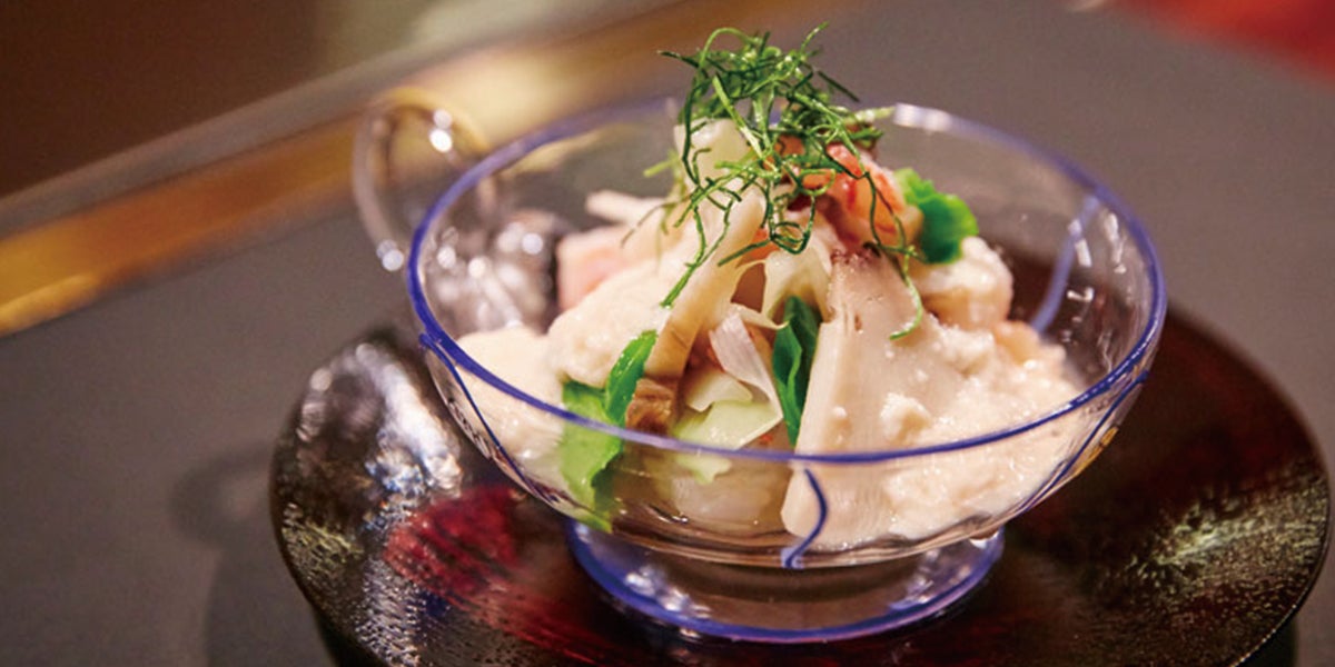 森さんは言います。「靖一郎豆乳には大豆本来の甘味やコクがあり、それでいてさわやかです。あわびとエビの1品では出汁として靖一郎豆乳を使用。少し蒸すことでトロとさせるだけでなく、上品な甘さも引き出しました。また、靖一郎豆乳のおからも気に入っています。甘さと香りのバランスがすばらしいのです。少し炒めて裏ごししたおからを牛肉とあえることで、肉のうま味を引き立てつつ、大豆の香りも楽しめる1品になりました」。