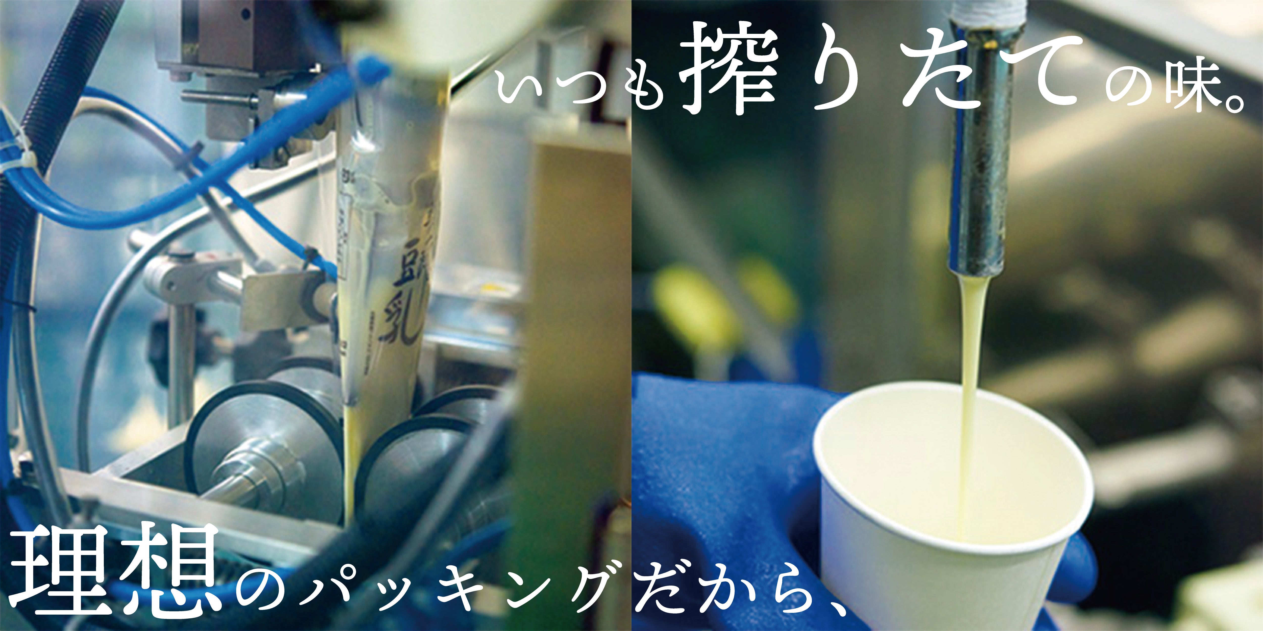 靖一郎豆乳はいかに最適なパッキングをするかを考え尽くしました。できあがったばかりの豆乳を80℃の高温のまま、瞬時にパッキングします。空気の流入を最小限に抑え、酸化を防ぎ、豆乳の本来のおいしさや風味を逃しません。また、専用のフィルムパッケージを採用しているため、高温に耐え、破損に強く、確かな堅牢性をもつのです。
