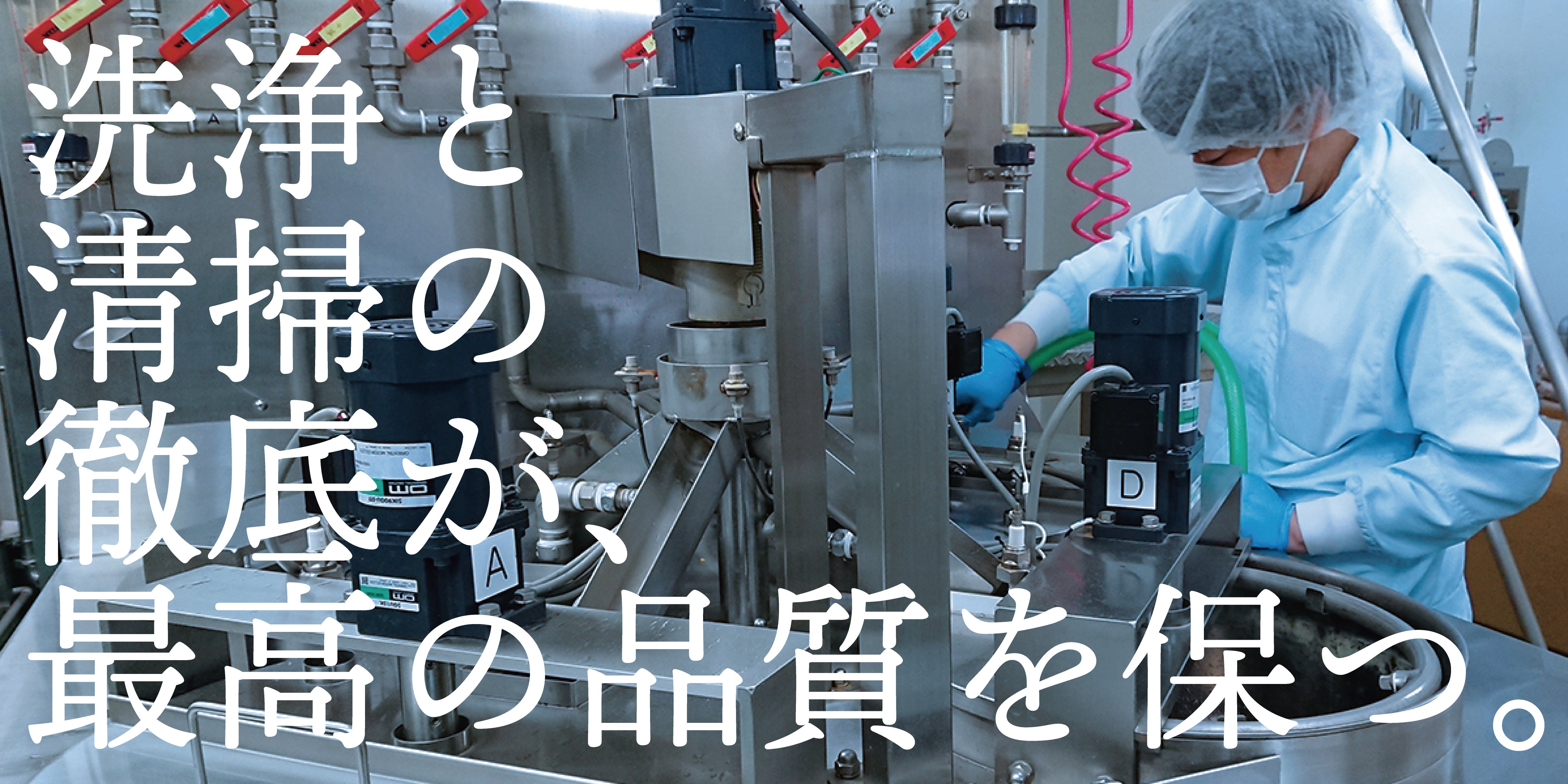 靖一郎豆乳のこだわりは豆乳づくりだけではありません。豆乳づくりは、酸化を防ぐため製造するときは一気につくります。しかし靖一郎豆乳の1日はそれで終わるわけではありません。製造前に清掃1時間半、そして製造後に清掃3〜4時間。タンクの中はもちろんパイプの中まで丁寧に清掃します。豆乳のタンパク質は菌が繁殖しやすい。少しも大豆のカスを残すことなく、隅々にまで清掃されているからこそ、大豆と水というシンプルな素材の持ち味を最大限に引き出すことができるのです。つまり、完全無添加の、ごまかしのきかない靖一郎豆乳のおいしさは、日々の、時間と労力を惜しまない、徹底した清掃が支えているのです。